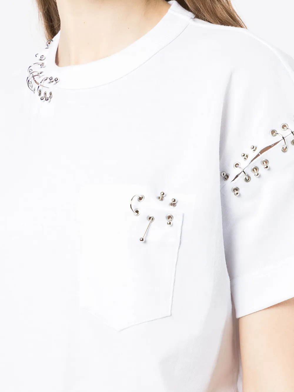 Люверсы, серебристая фурнитура, круглый вырез, короткие рукава, прямой подол и укороченная длина. Цвет: белый.