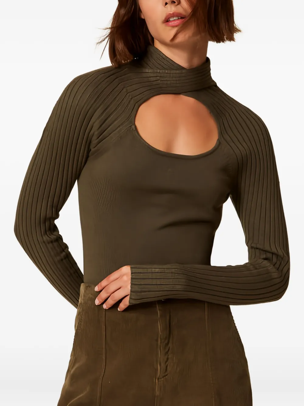 Оливково-зеленый топ с высоким воротом, вырезами, ребристой текстурой и длинными рукавами