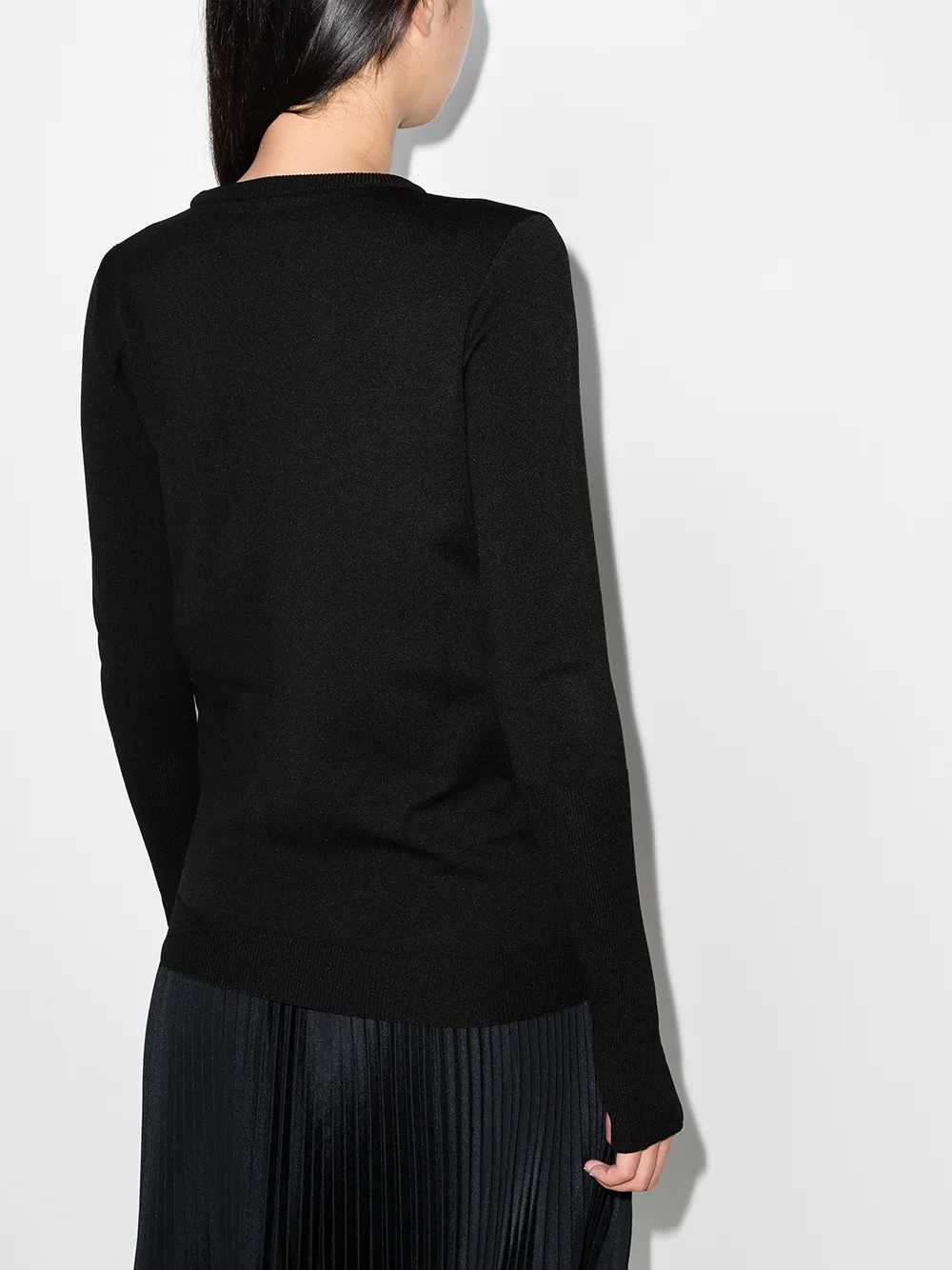 Трикотажный материал, логотип в технике интарсия, детали с оборками, круглый вырез, длинные рукава и прямой подол. Цвет: черный.