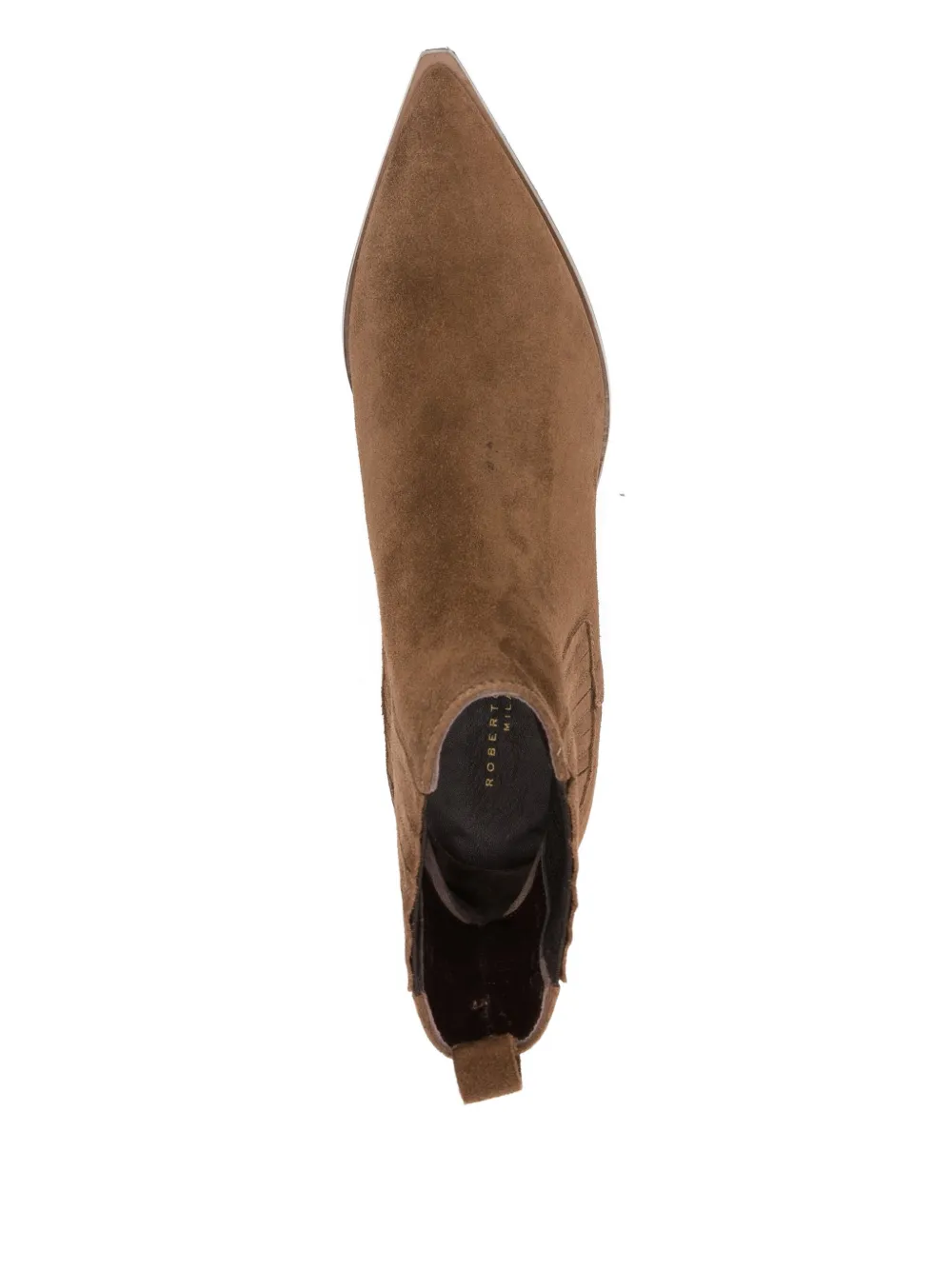 Коньячного цвета ботильоны с язычком-петлей, заостренным носком, на устойчивом каблуке, с панельным дизайном, длиной до щиколотки