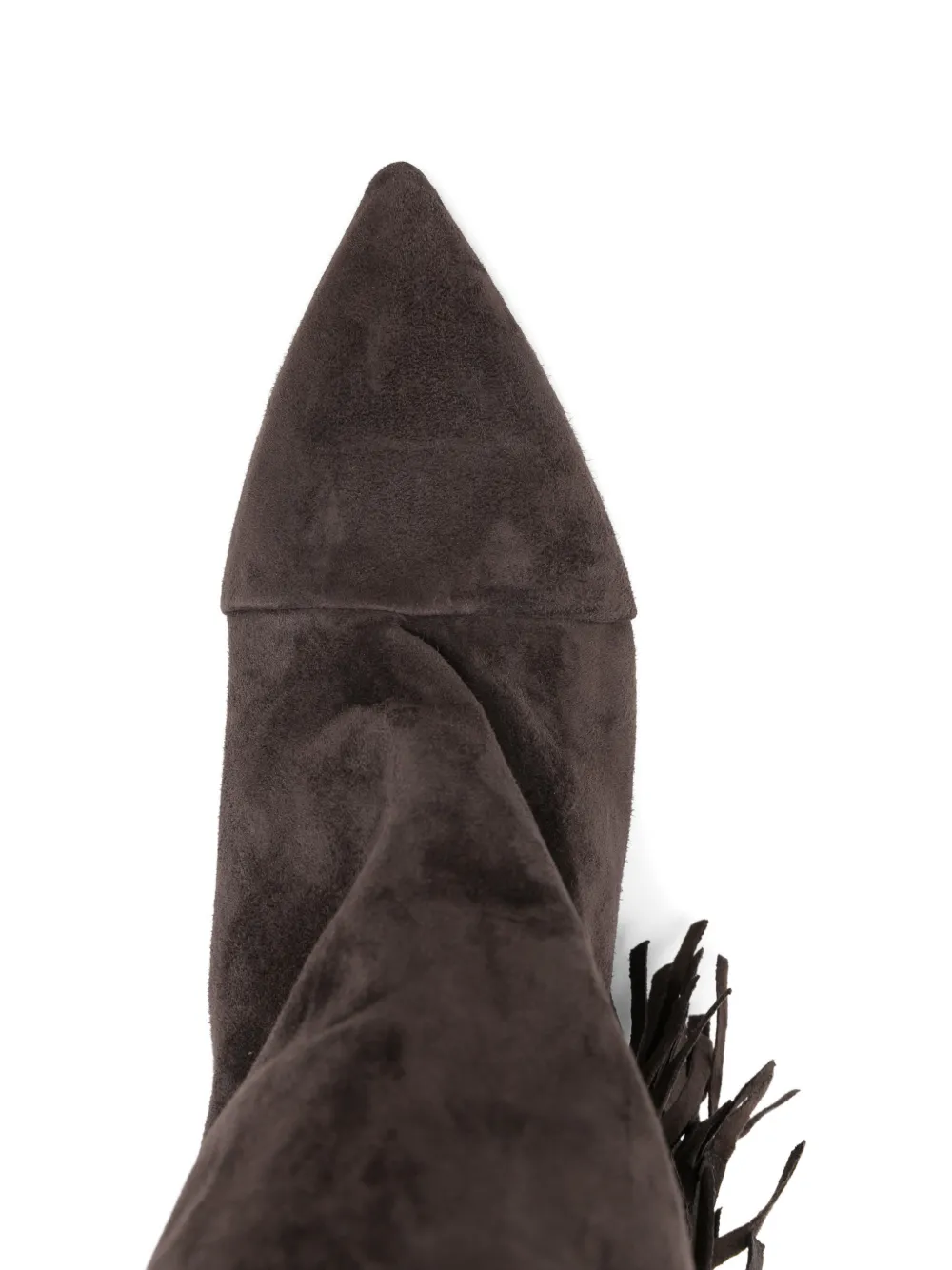 Темно-коричневые ботильоны с заостренным носком, на конусовидном каблуке, с бахромой и отворотом