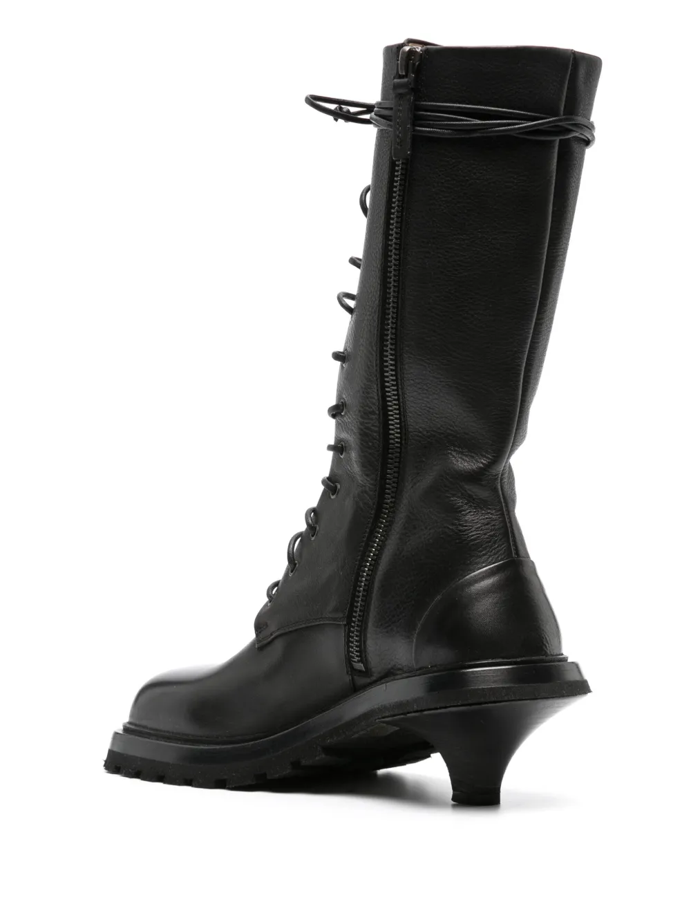 Черный, телячья кожа, гладкая текстура кожи, квадратный носок, шнуровка спереди, застежка на молнии сбоку, длина до середины икры, низкий скульптурный каблук и резиновая подошва.