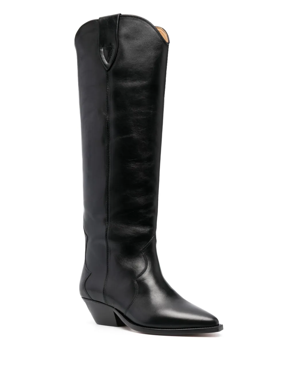 Черный, телячья кожа, заостренный носок, модель без застежки, блочный каблук средней высоты и высота по колено.