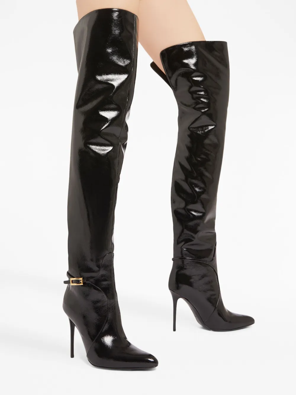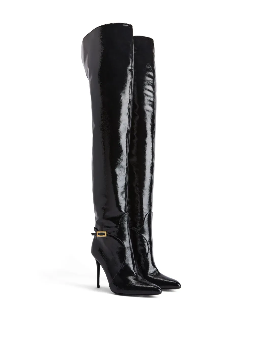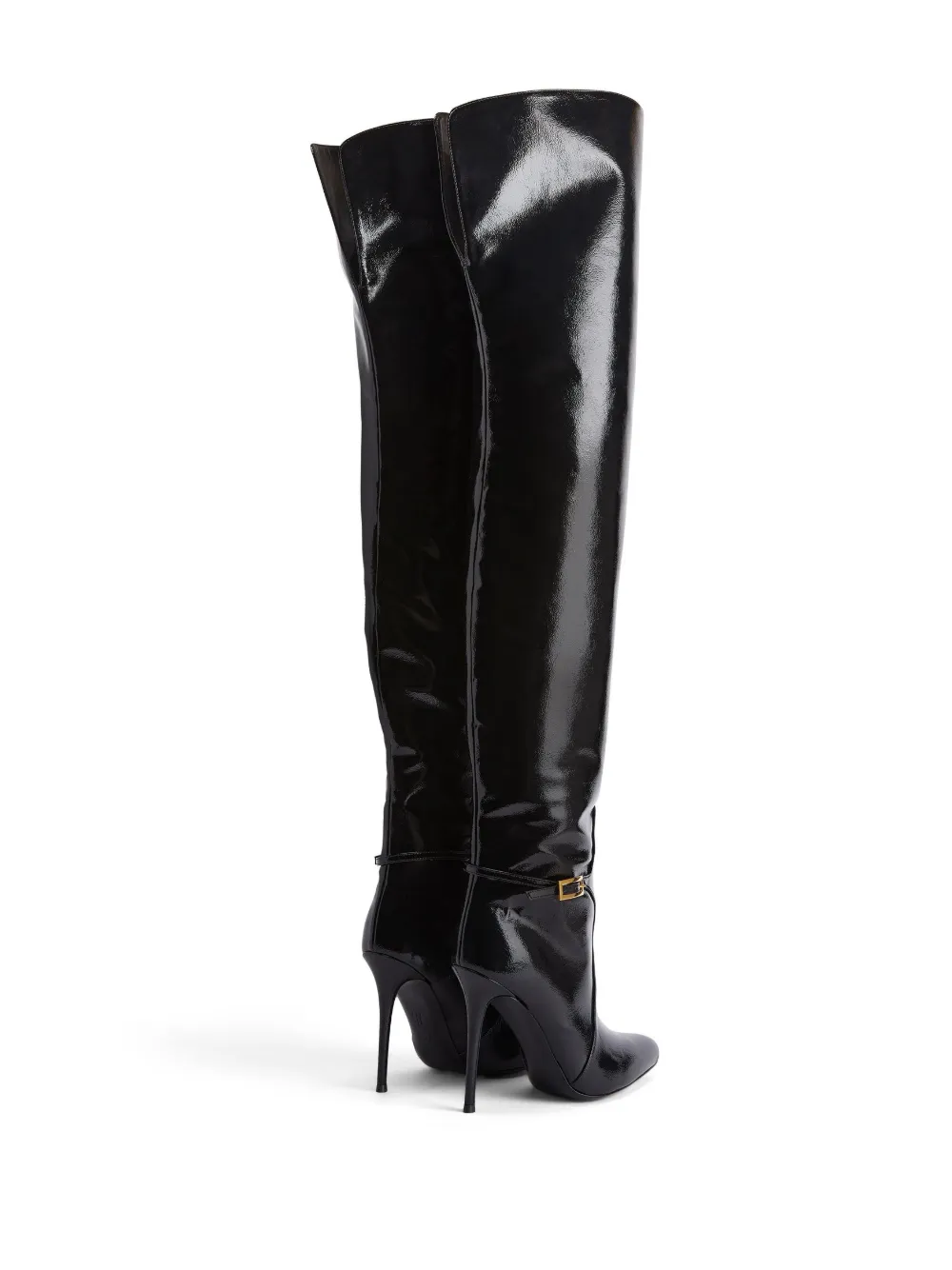 Черный, кожа, золотистая фурнитура, декоративные пряжки, заостренный носок, длина выше колена, вырез сзади и каблук на высокой шпильке.