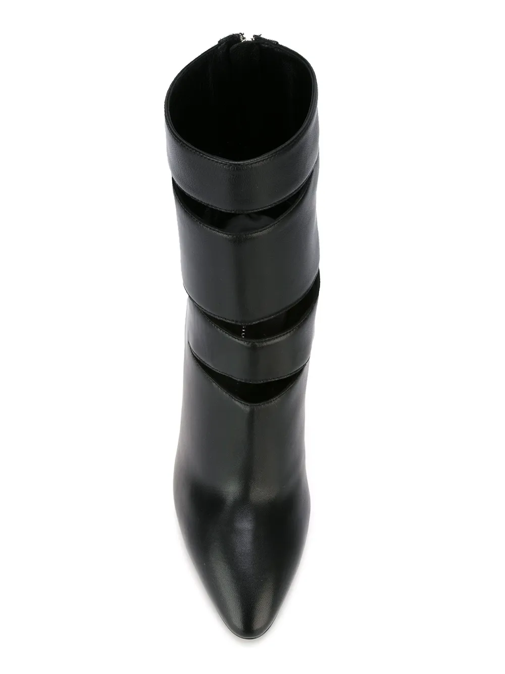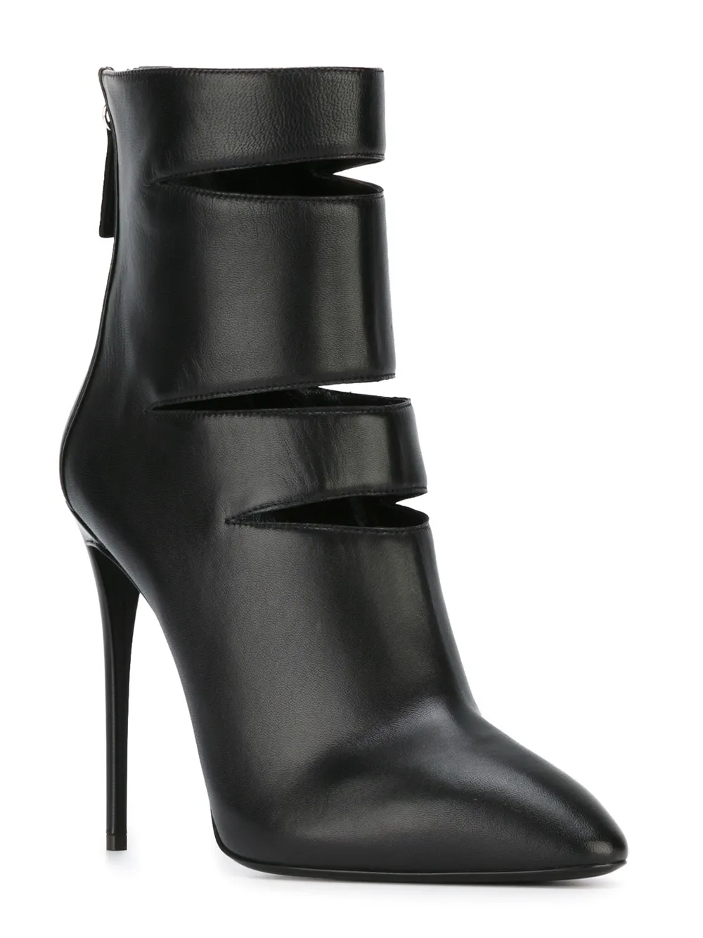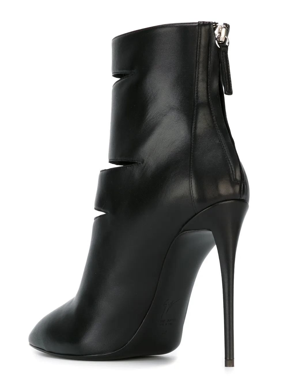 Черные кожаные ботильоны с разрезами от Giuseppe Zanotti Design. Заостренный носок, застежка на молнии сзади, высокая шпилька.