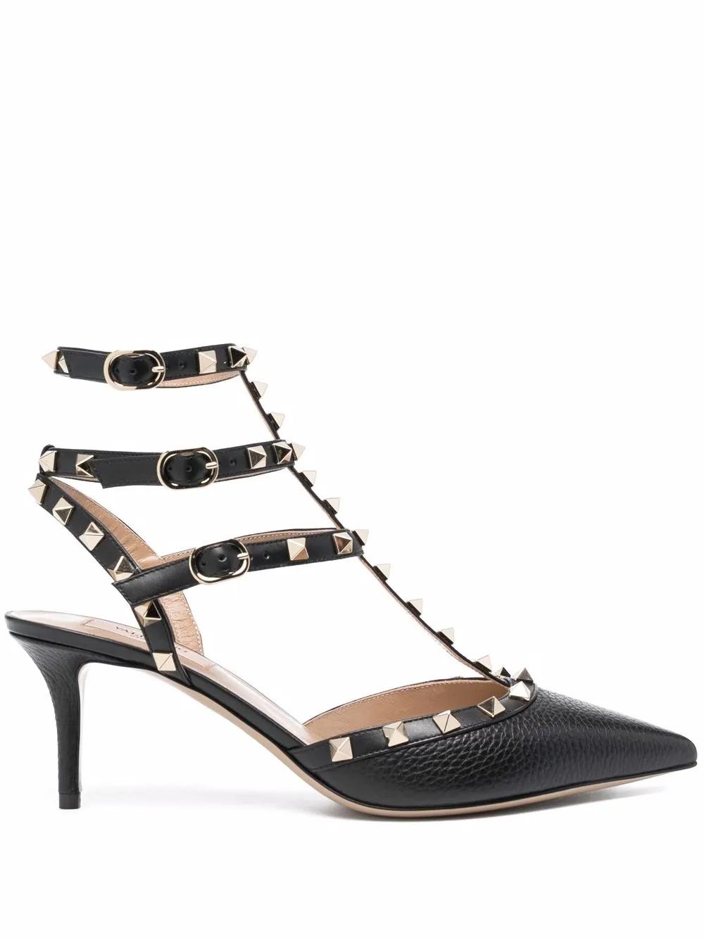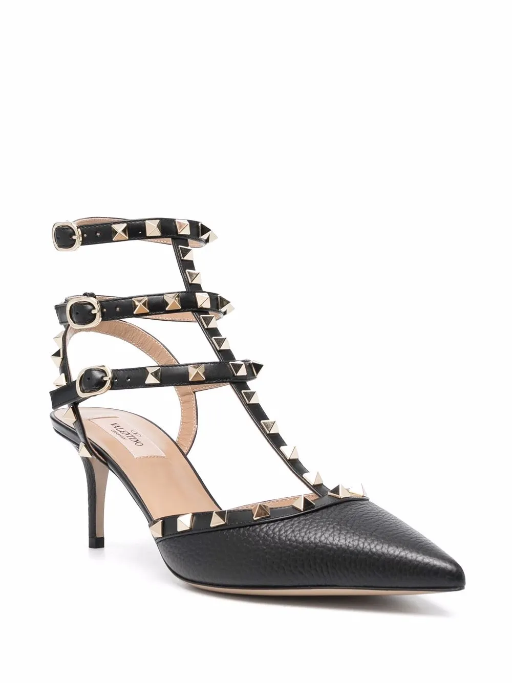 Заостренный носок, стелька с логотипом, тональная строчка, конструкция с внешним каркасом, золотистые заклепки Rockstud, боковые застежки с пряжками и каблук средней высоты. Цвет: черный.