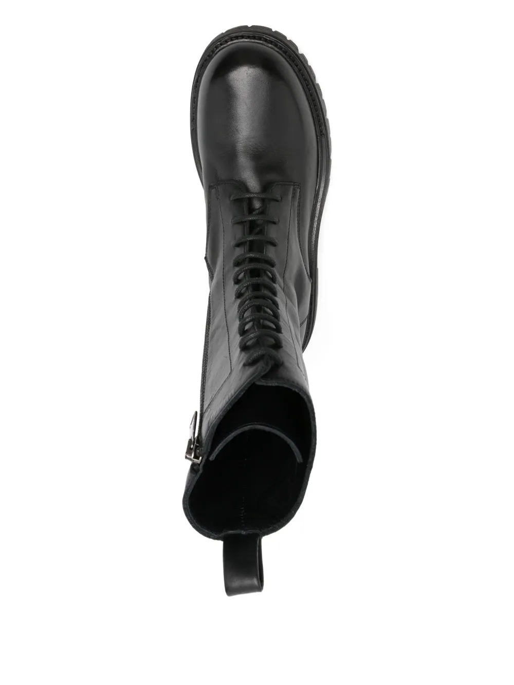 Черная шнуровка, застежка-молния сбоку, петля на верхней части, рифленая подошва, круглый носок