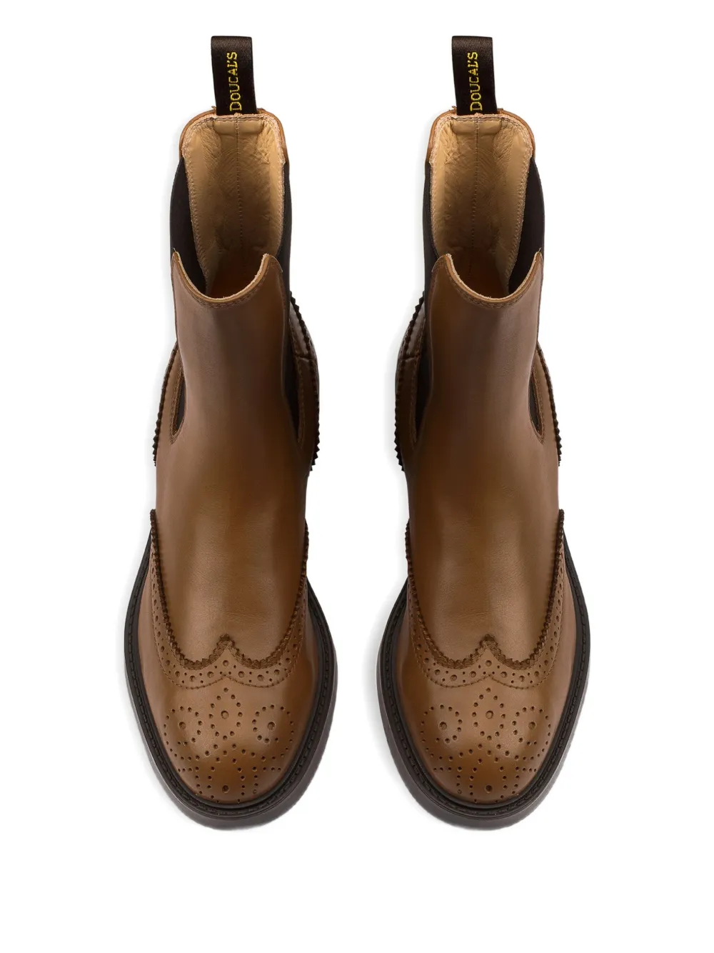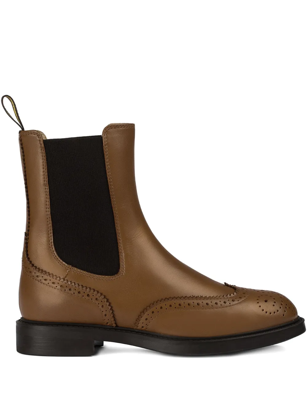 Коричневая телячья кожа, эластичные боковые вставки, броггирование, закругленный носок, плоская подошва