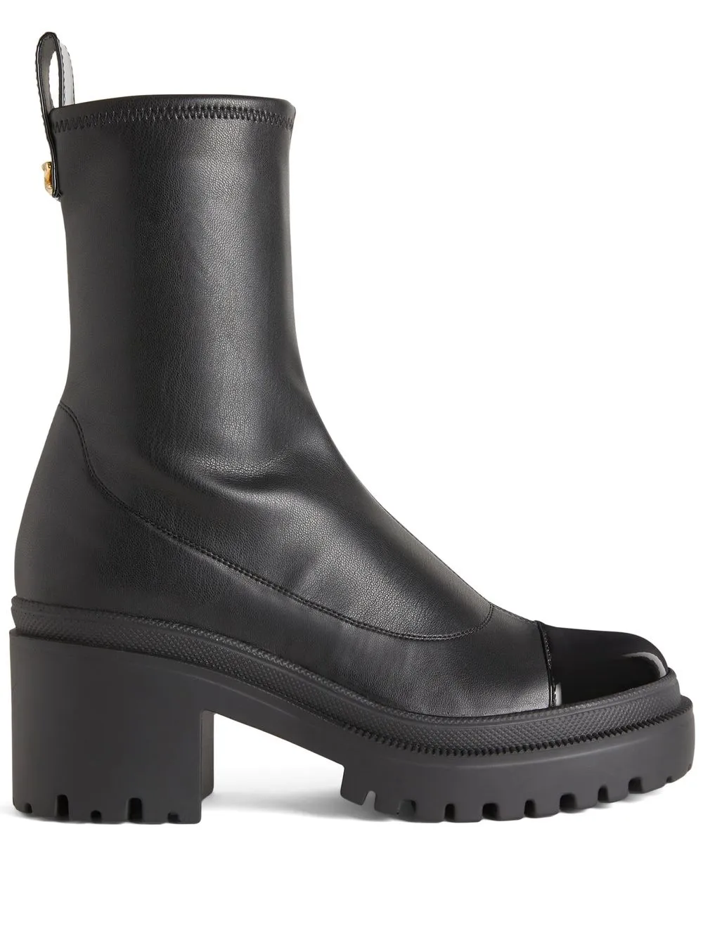 Черный, контрастная отделка, контрастный носок, золотистый металлический логотип, тисненый логотип сзади, узкий крой, закругленный носок, высота по щиколотку, блочный каблук средней высоты и рифленая резиновая подошва.