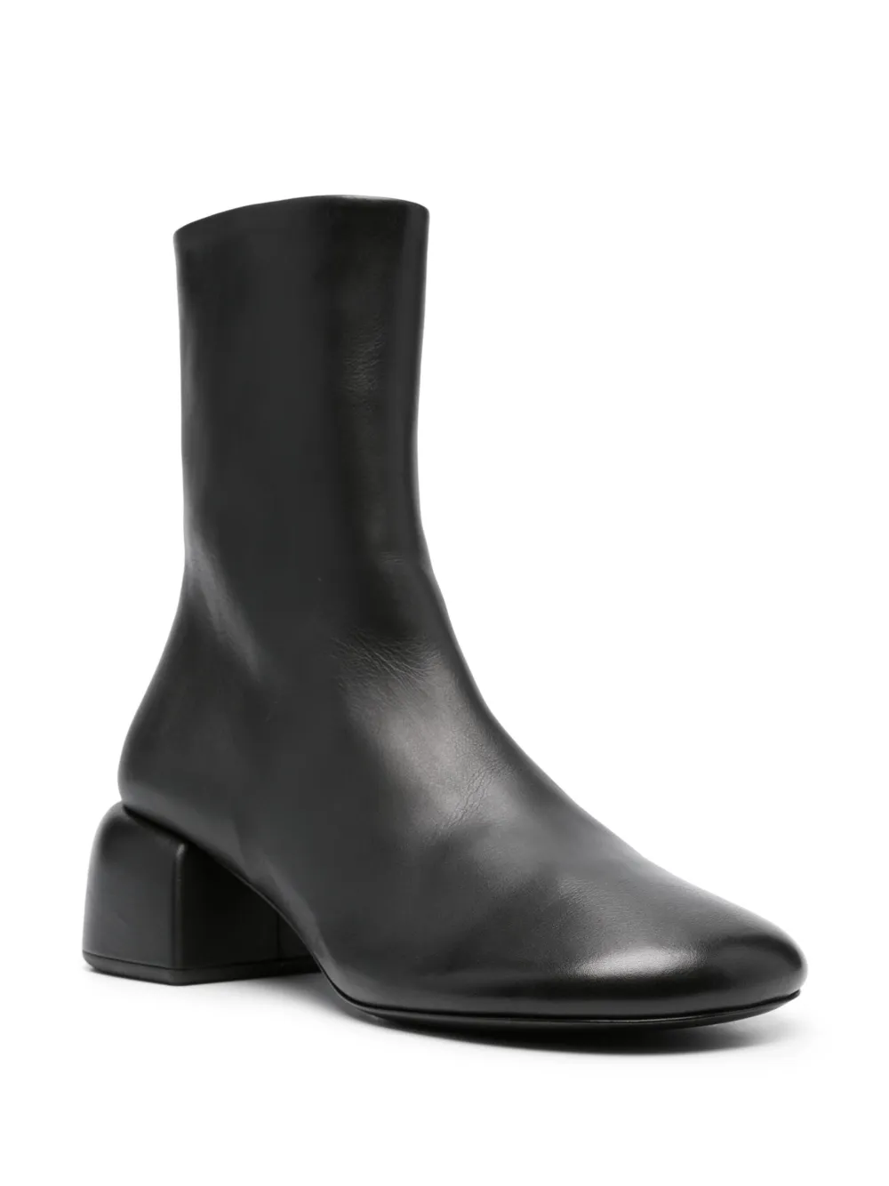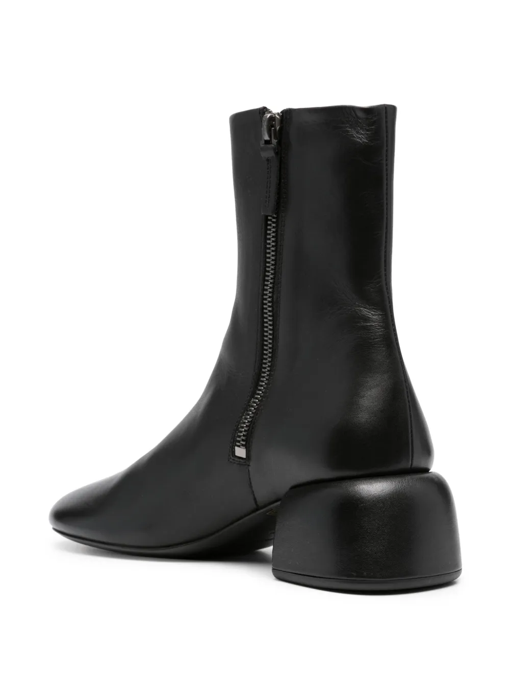 Черный, телячья кожа, короткая застежка на молнии сбоку, кожаная стелька с логотипом, блочный каблук средней высоты и закругленный носок.