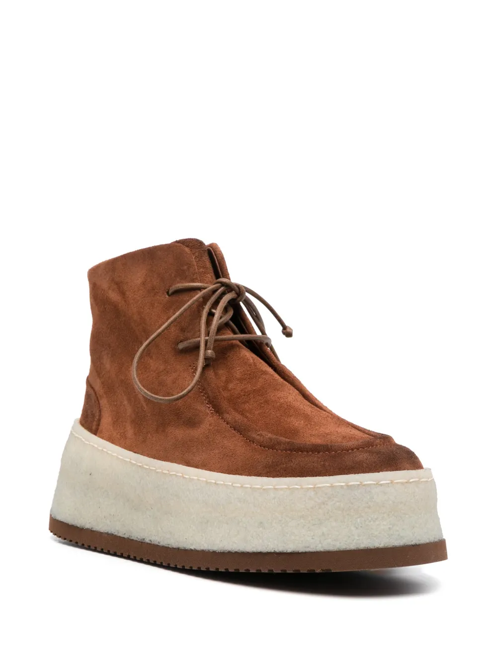 Коньячный коричневый, замша из телячьей кожи, высота по щиколотку, шнуровка спереди, закругленный носок, кожаная стелька с логотипом и подошва на платформе.