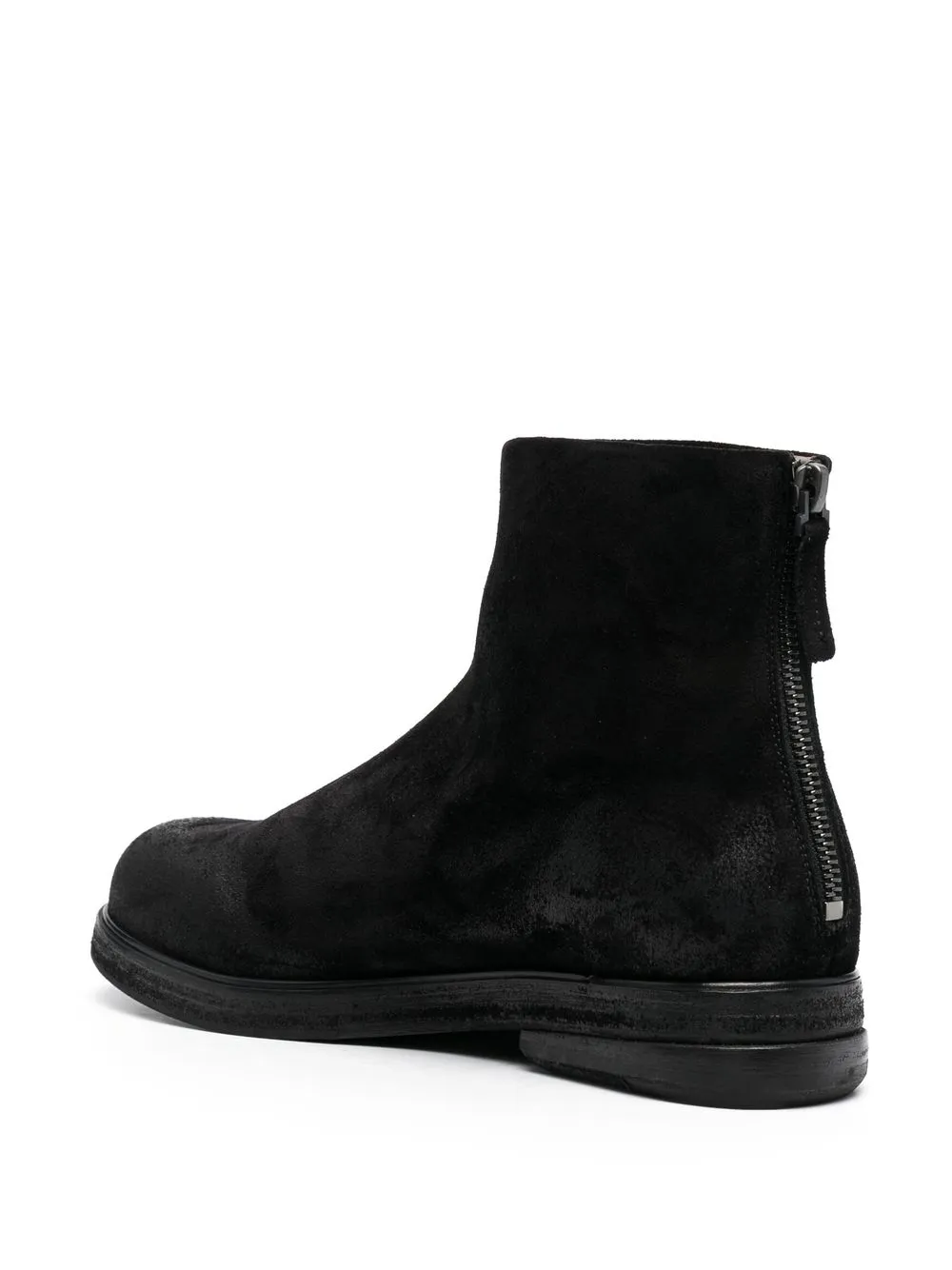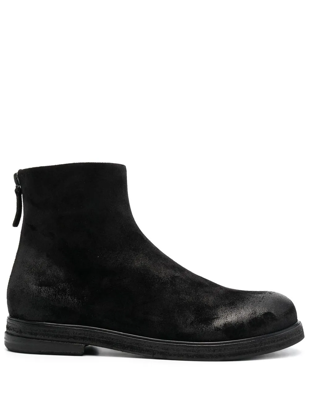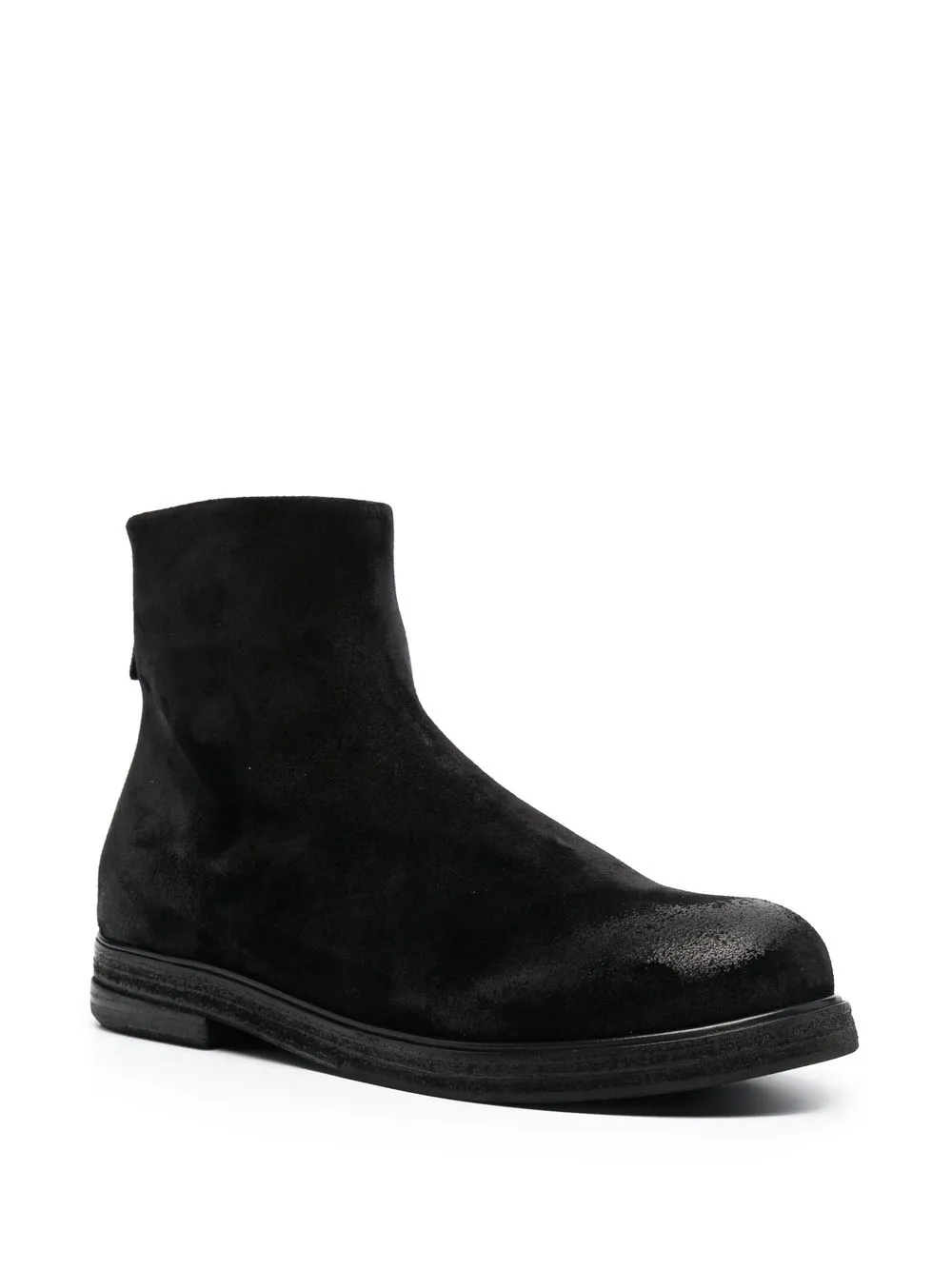 Черный, замша из телячьей кожи, застежка на молнии сзади, закругленный носок и плоская резиновая подошва.