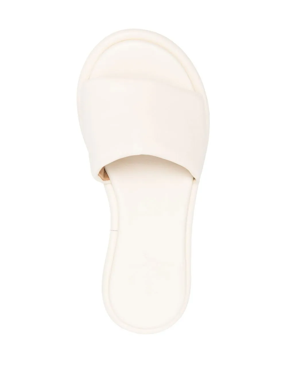 Кремовый, телячья кожа, закругленный носок, открытая спина, ремешок на палец, логотип на стельке, каблук-рюмка и модель без застежки.