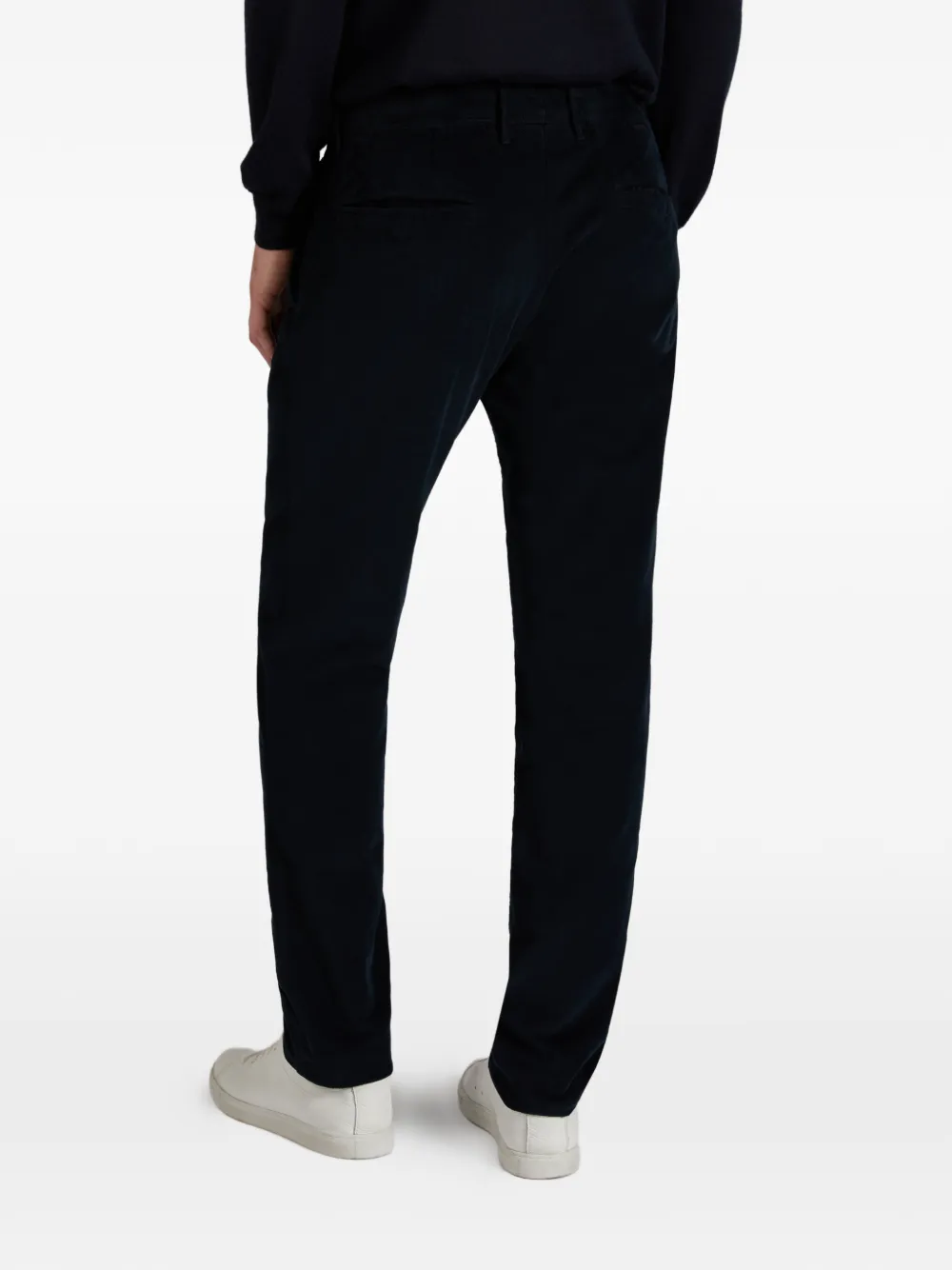 Темно-синяя бархатная фактура, зауженный крой, застежка на пуговицы, передние карманы, задние карманы
