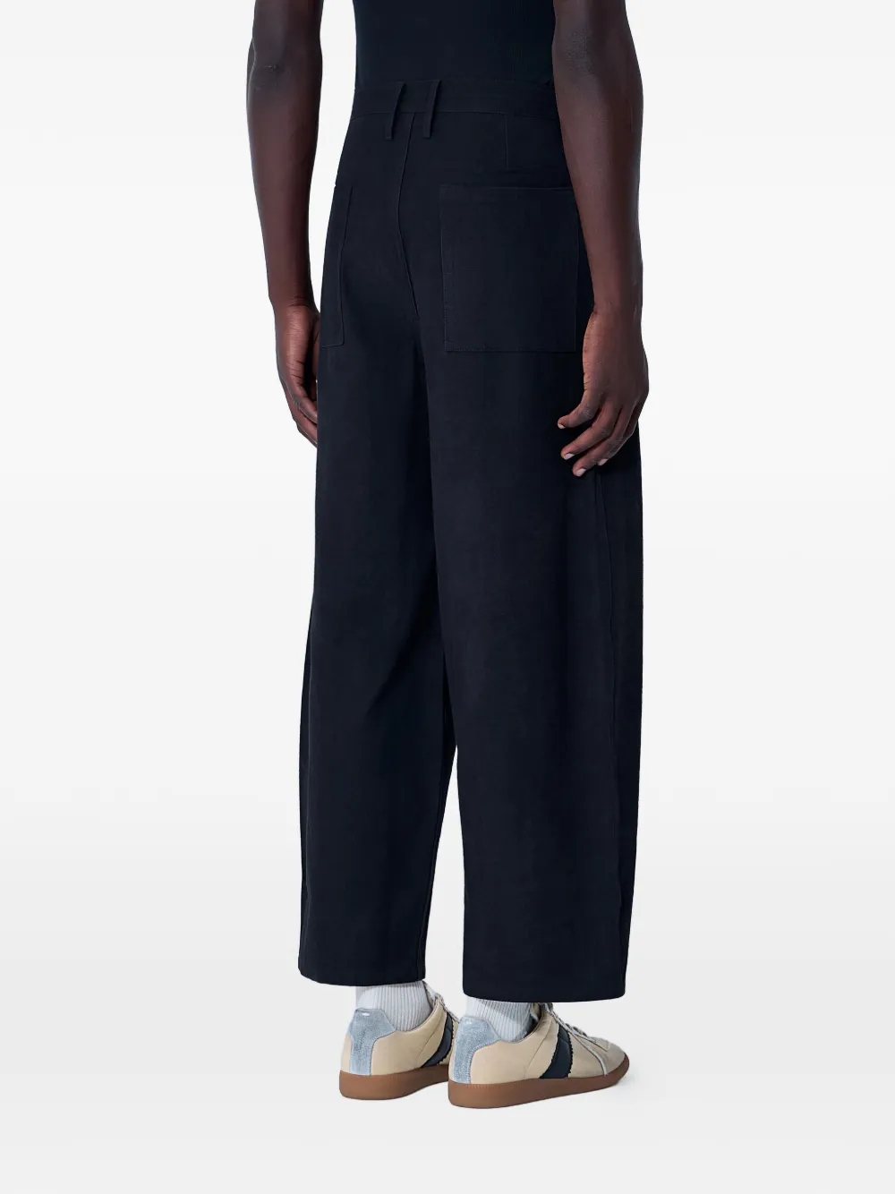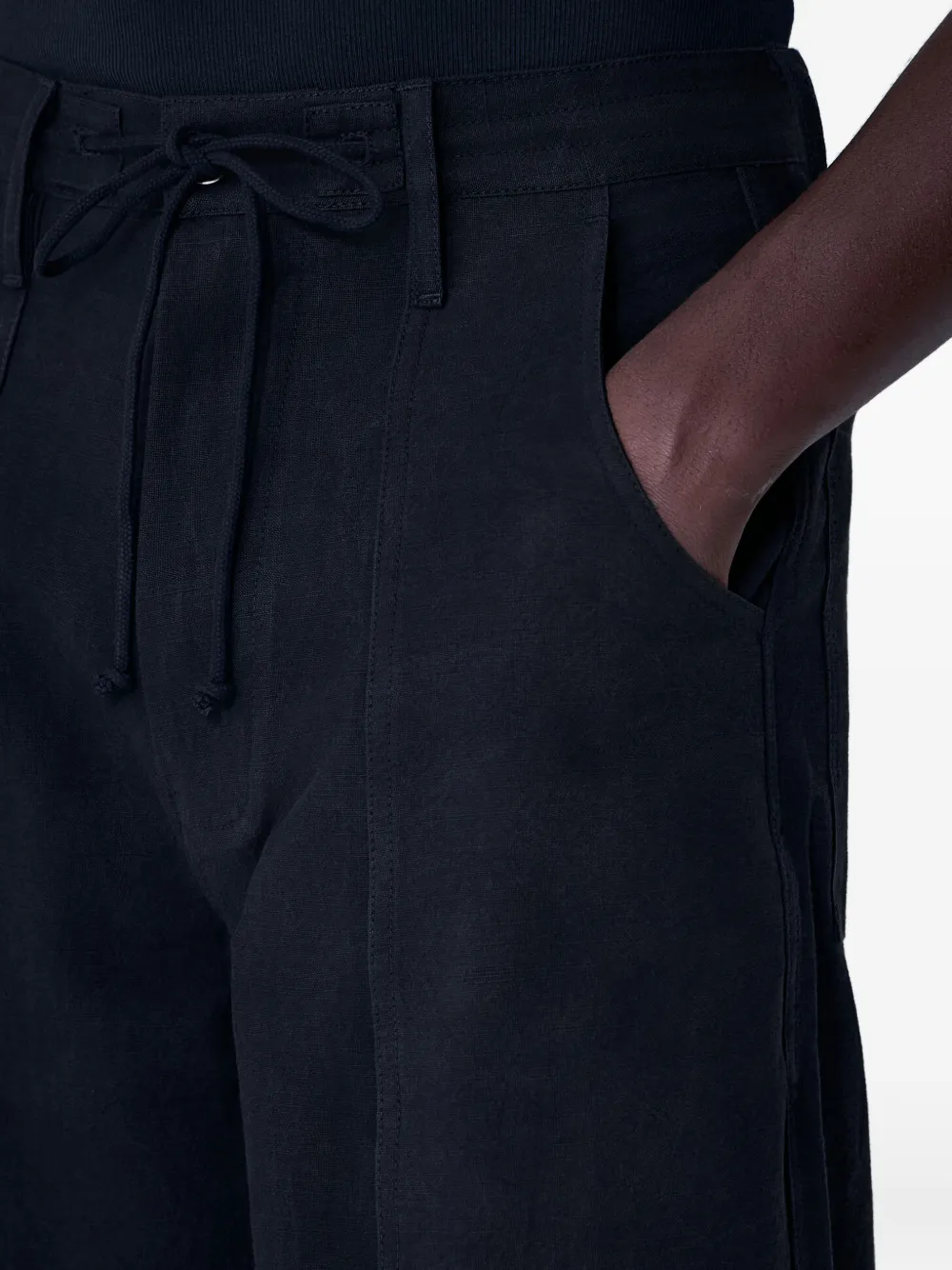 Черные боковые карманы, накладные карманы сзади, пояс на кулиске, шлевки для ремня, прямые брючины