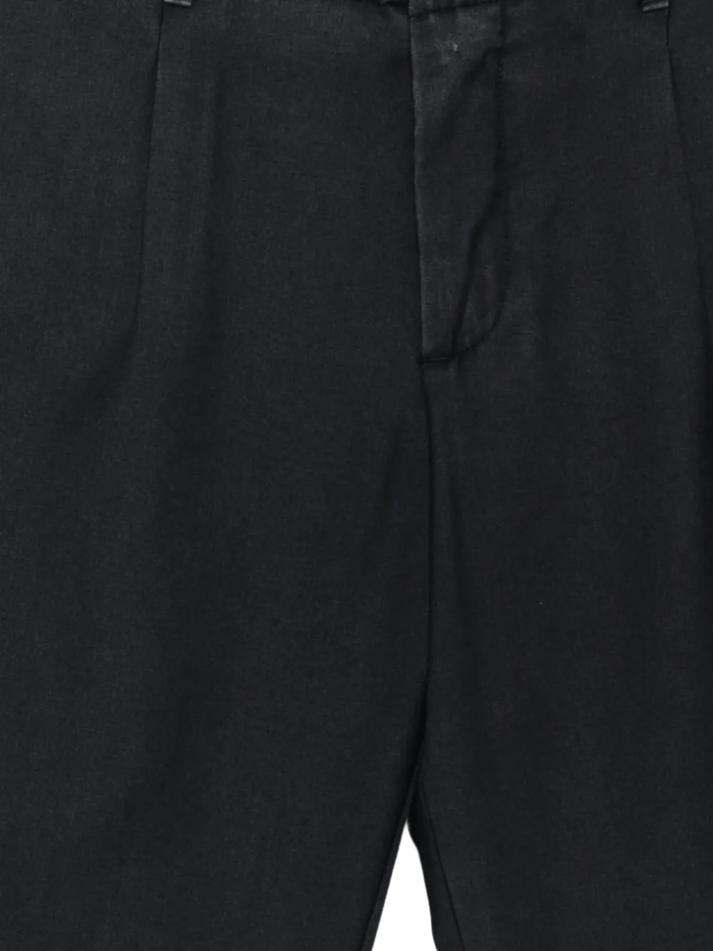 Темно-синие складки, застежка на пуговицы, шлевки для ремня, прорезные карманы, декоративная планка