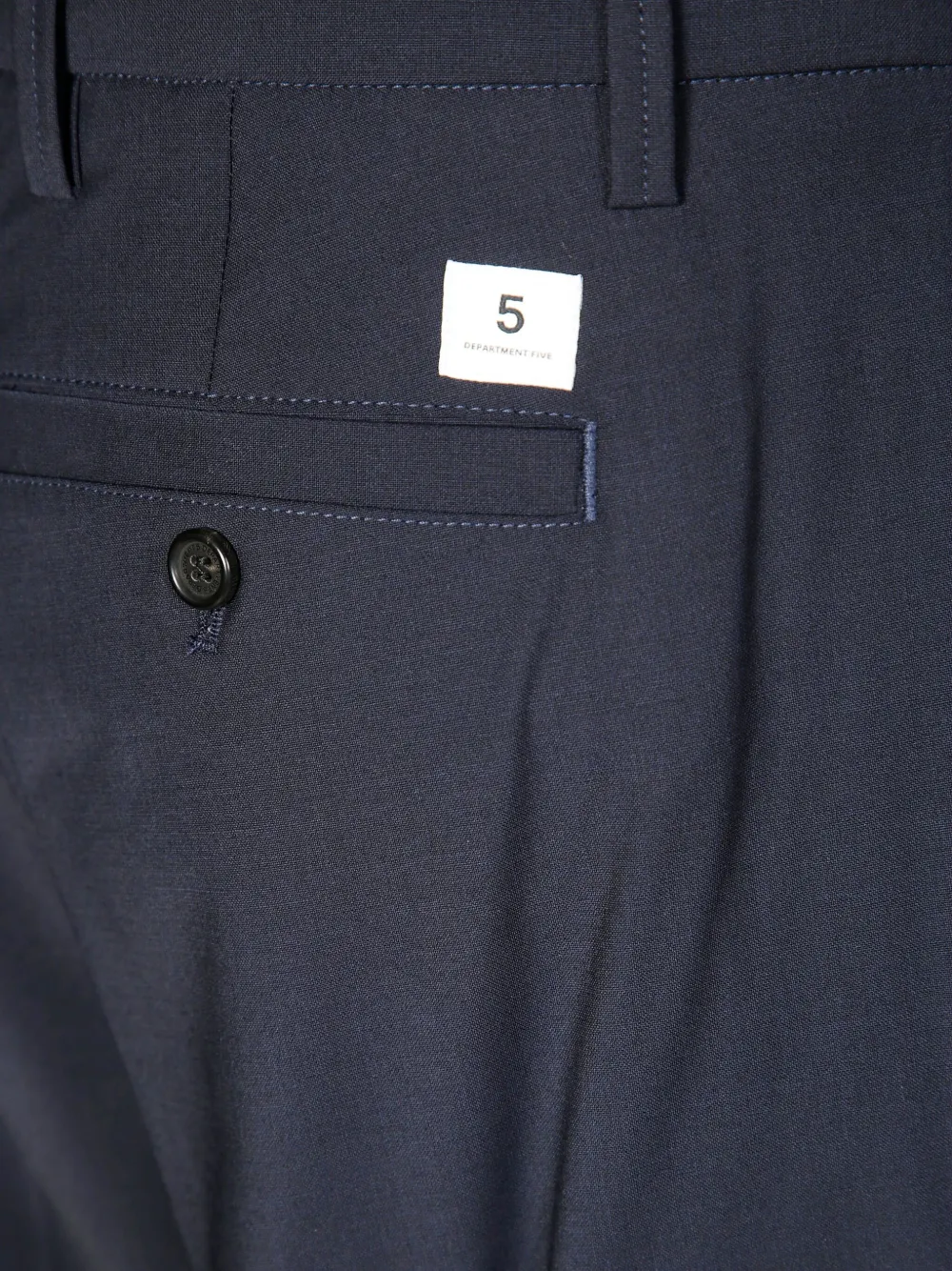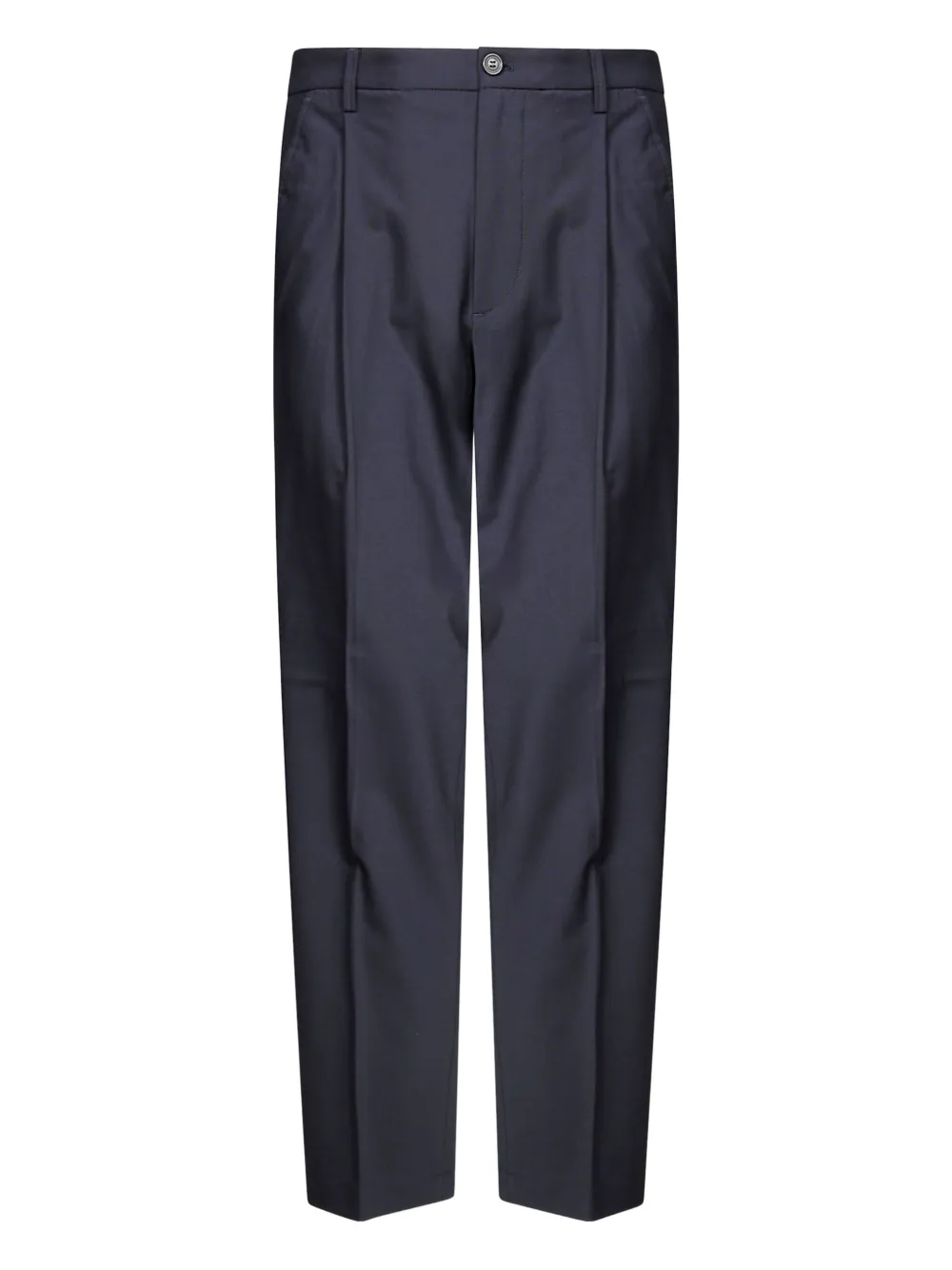 Темно-синие шлевки для ремня, застежка на пуговицу, задний прорезной карман, защипы спереди