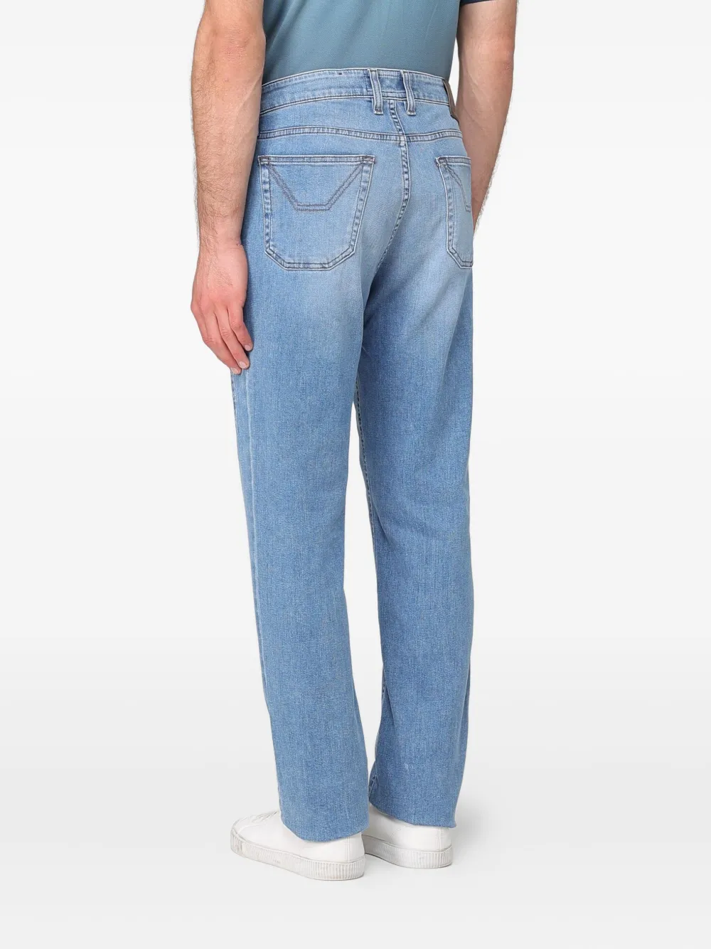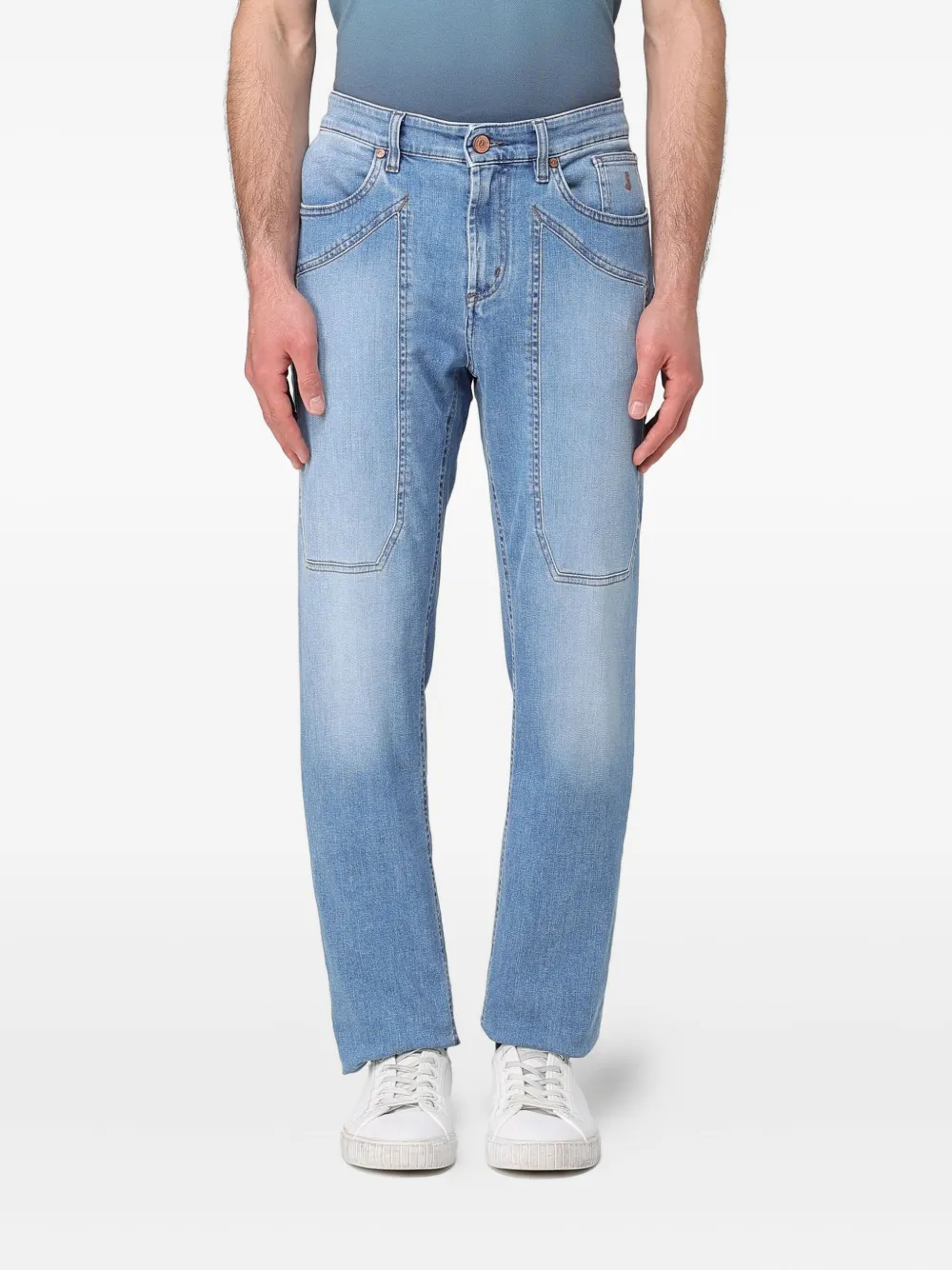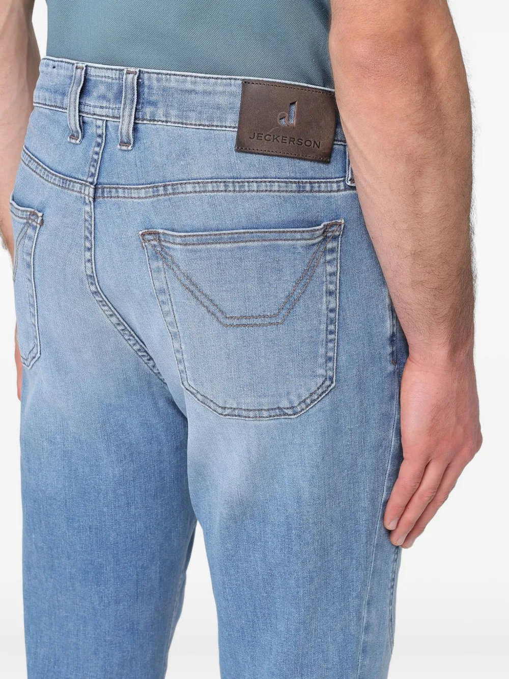Светло-голубой, с отделкой панелей, задний карман, шлевки для ремня, застежка на пуговицу, стандартный крой