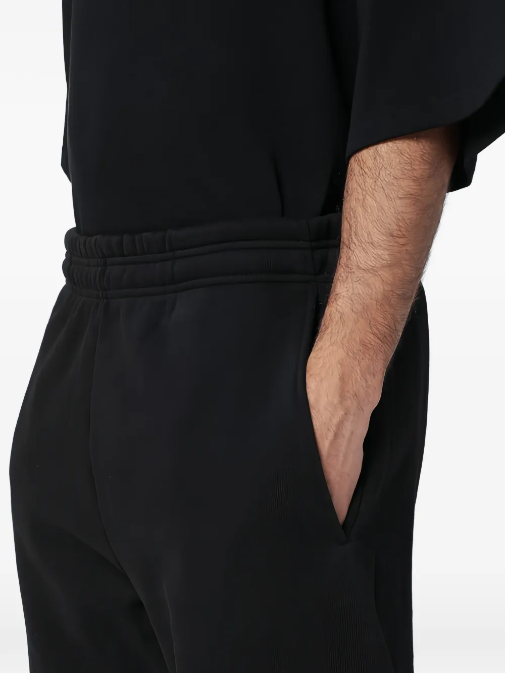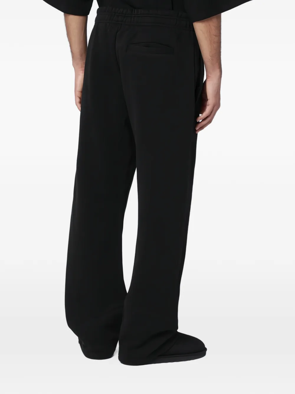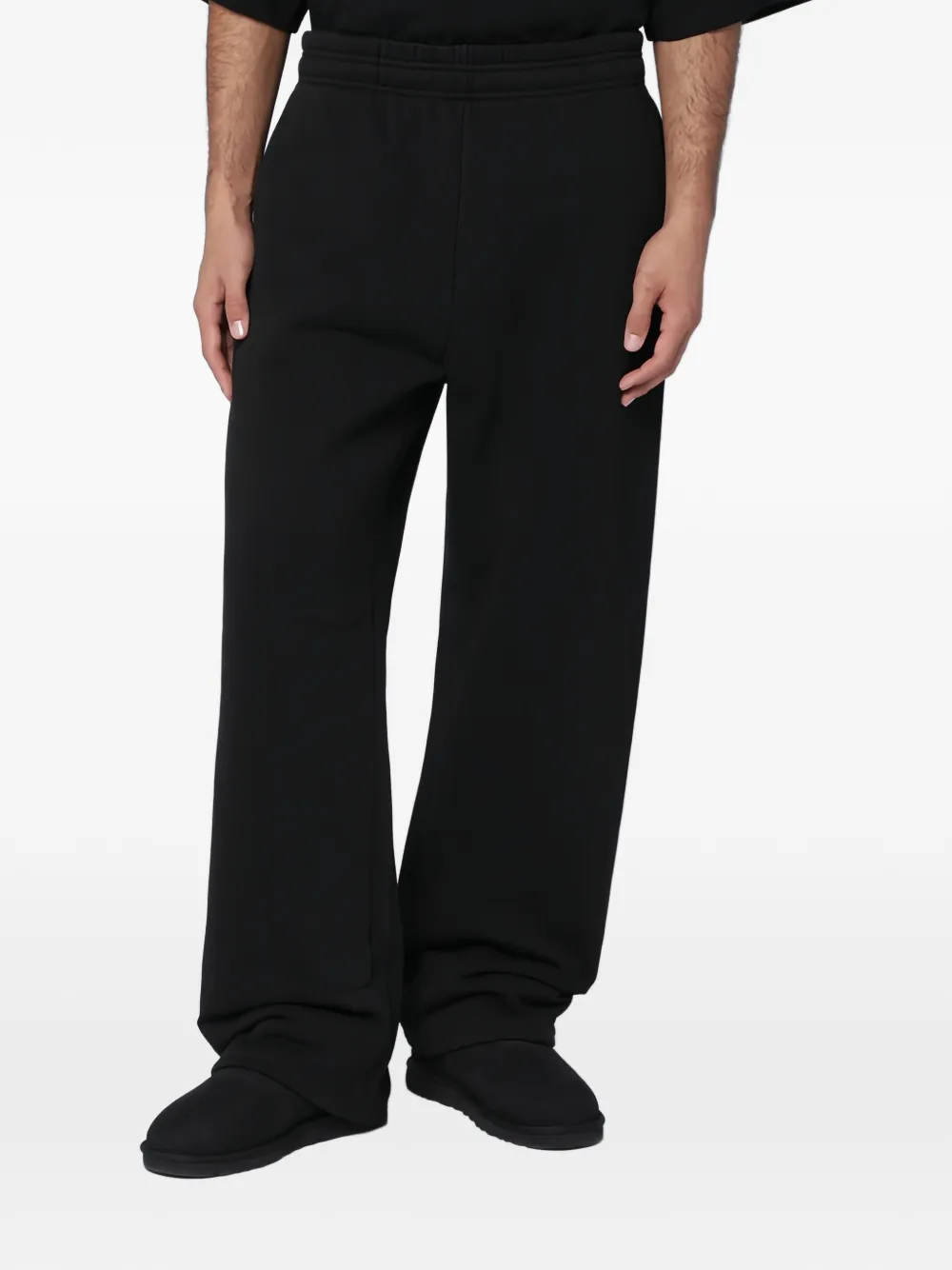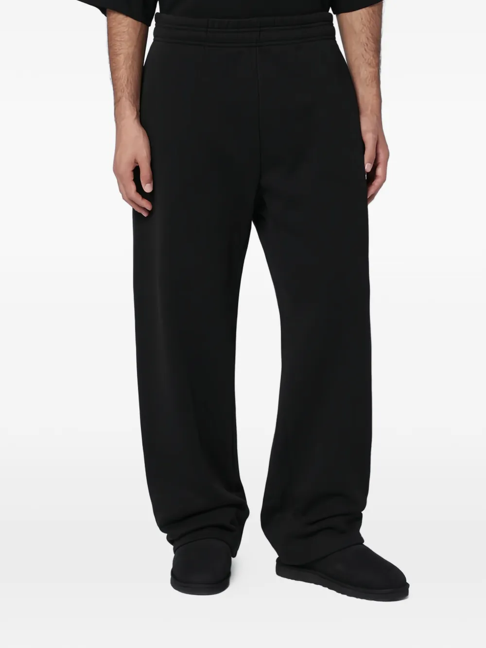 Черные, стандартного кроя, боковые карманы, задний карман, эластичный пояс, широкий фасон брючин