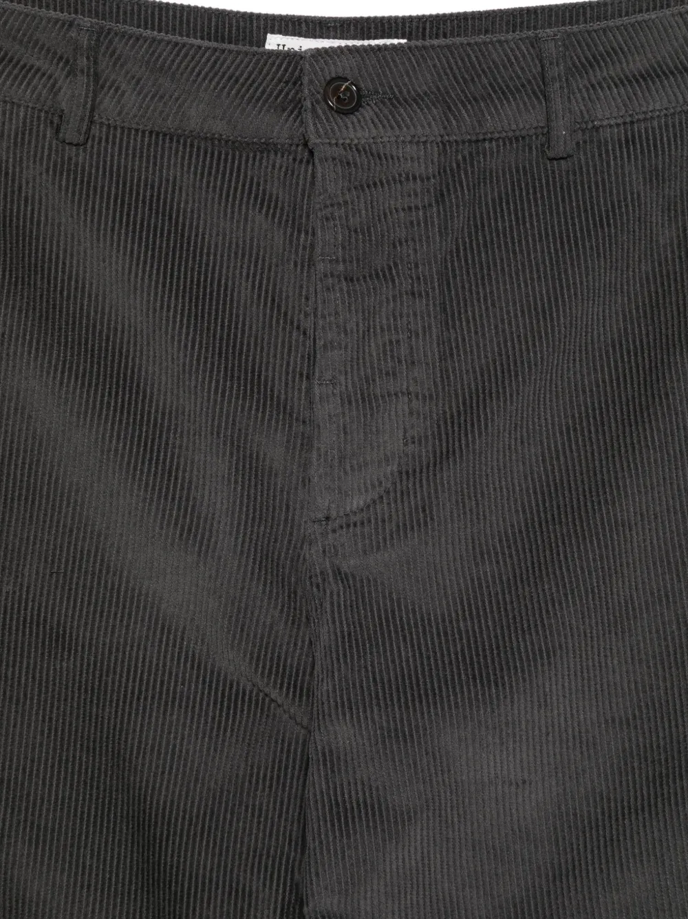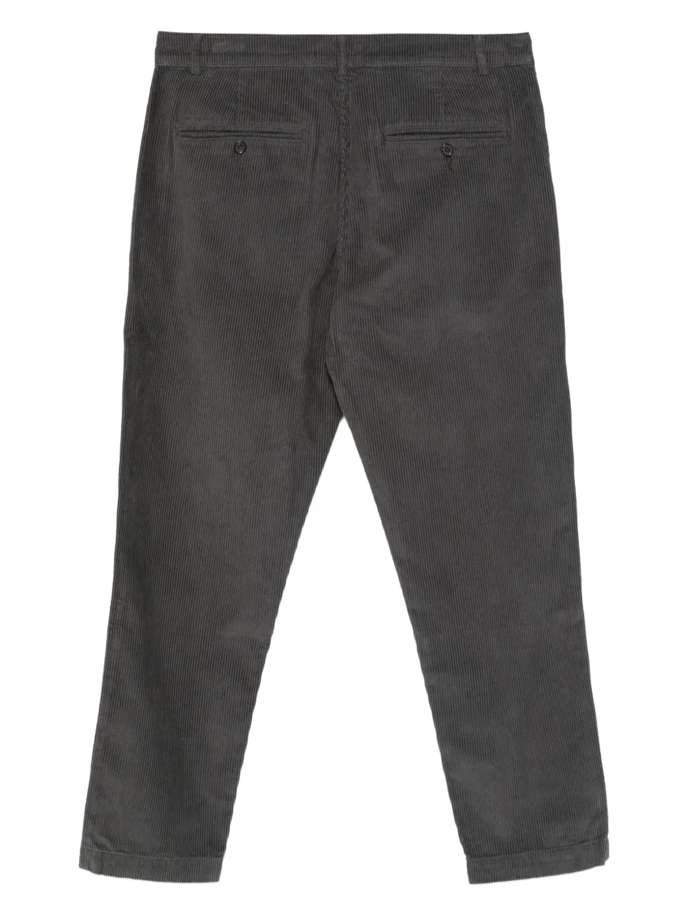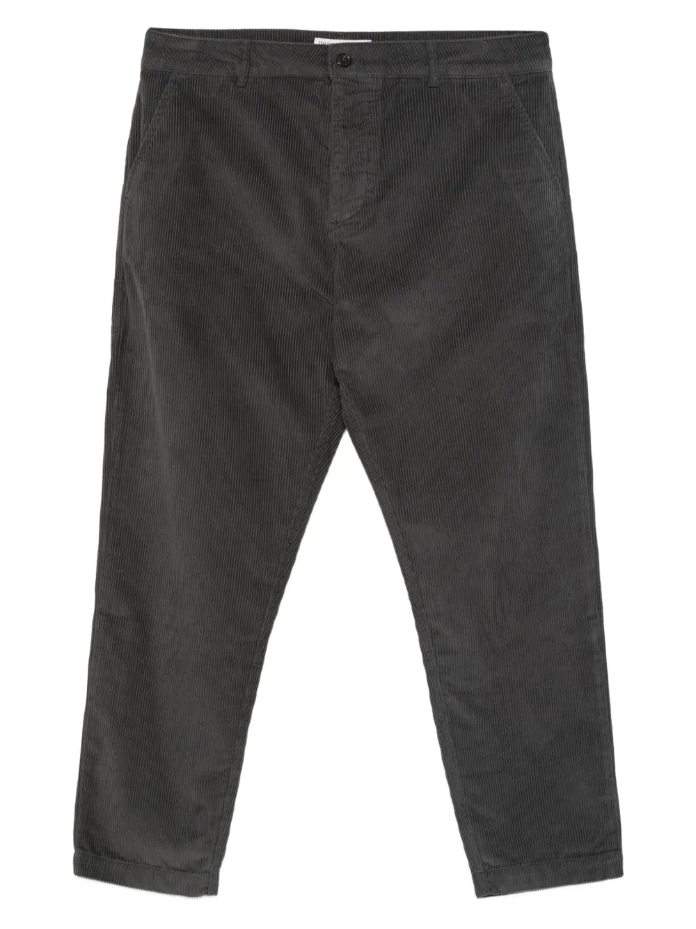 Угольно-серый хлопок, ребристая текстура, застежка на пуговицы и скрытая ширинка, прорезные карманы