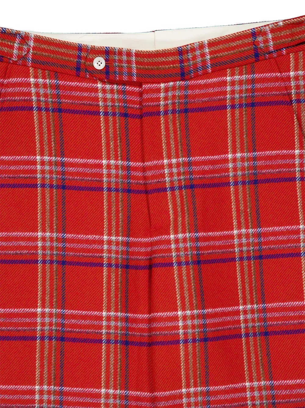Красная клетчатая ткань, застегивающиеся на пуговицы клапаны карманов, застежка на пуговицы, регулируемые боковые хлястики, прямые брючины
