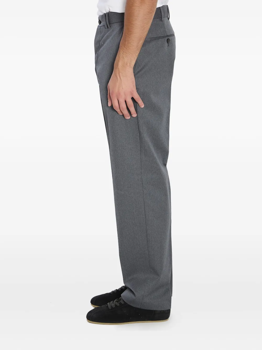 Серые шлевки для ремня, застежка на пуговицу, боковые карманы, задние карманы с клапанами, отделка пуговицами