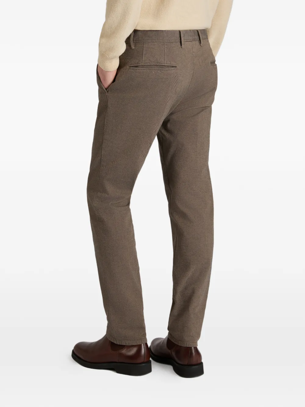 Коричневые накладные карманы сзади, боковые прорезные карманы, застежка на пуговицы