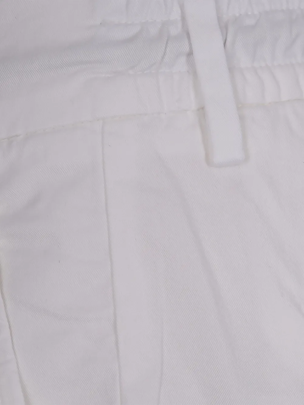 Белый цвет, завязки на шнурке, шлевки для ремня, застежка на пуговицу, задние карманы