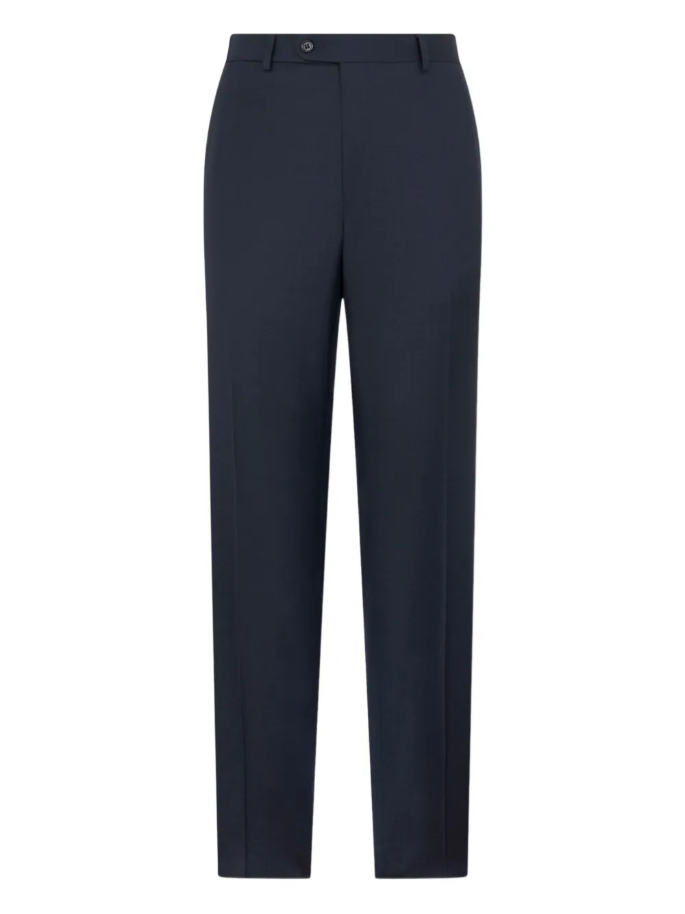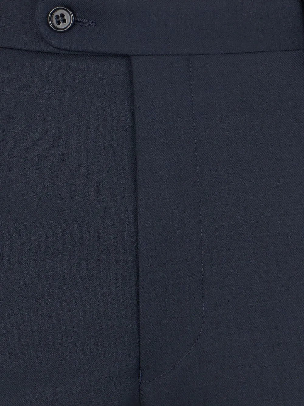 Темно-синие, застегиваются на пуговицу, шлевки для ремня, декоративная строчка, стрелка спереди, боковые карманы