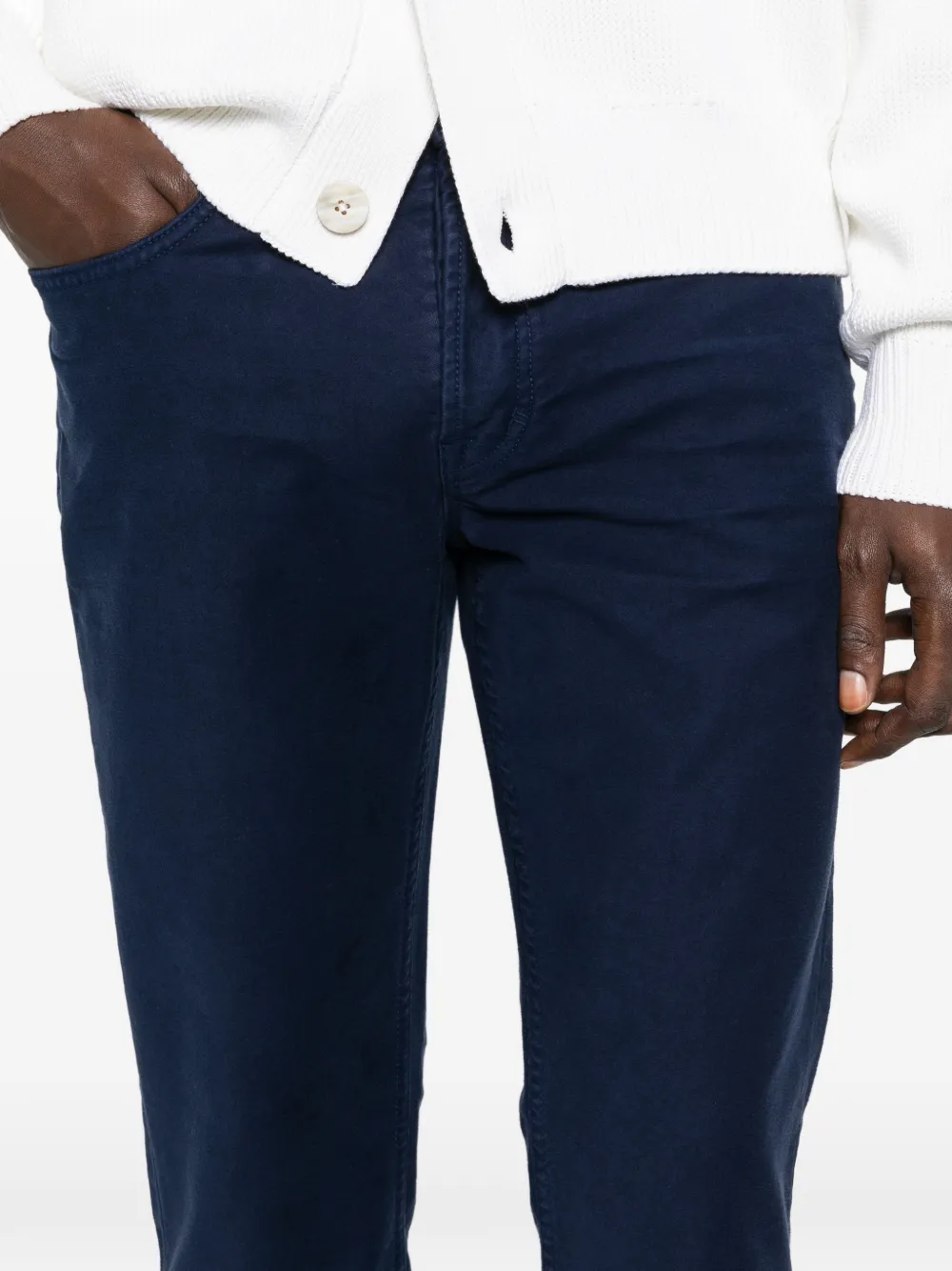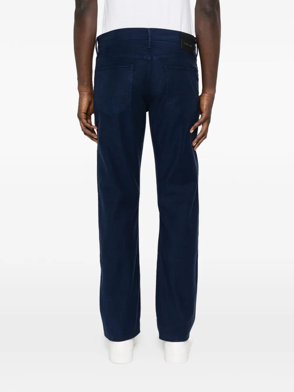 Темно-синие прямые брюки, шлевки для ремня, пять карманов, однотонная строчка