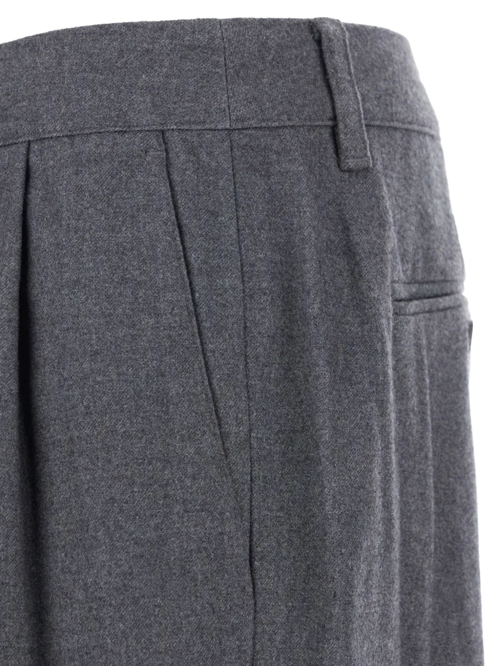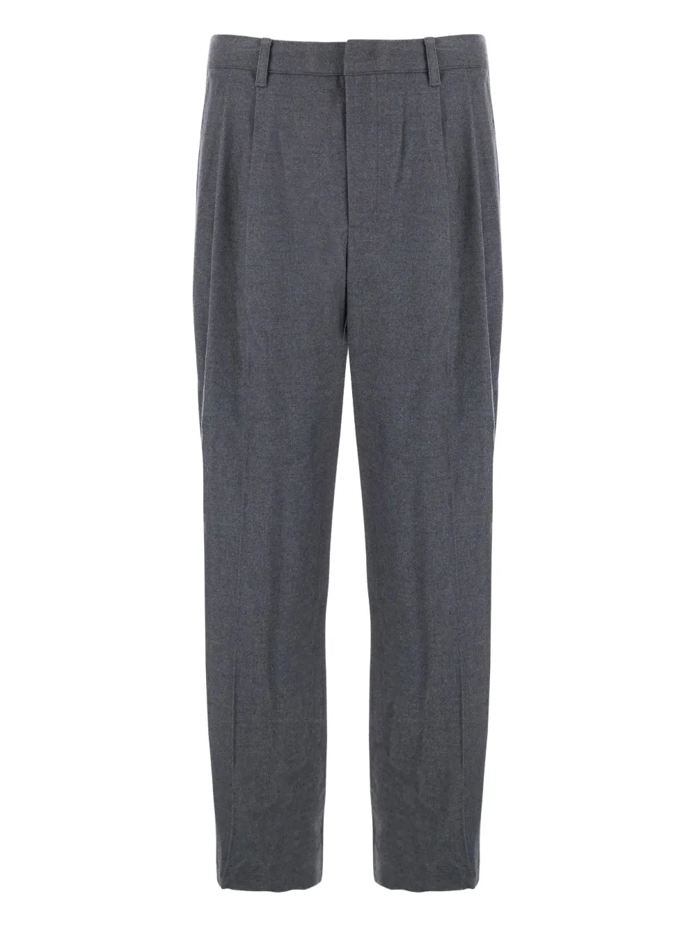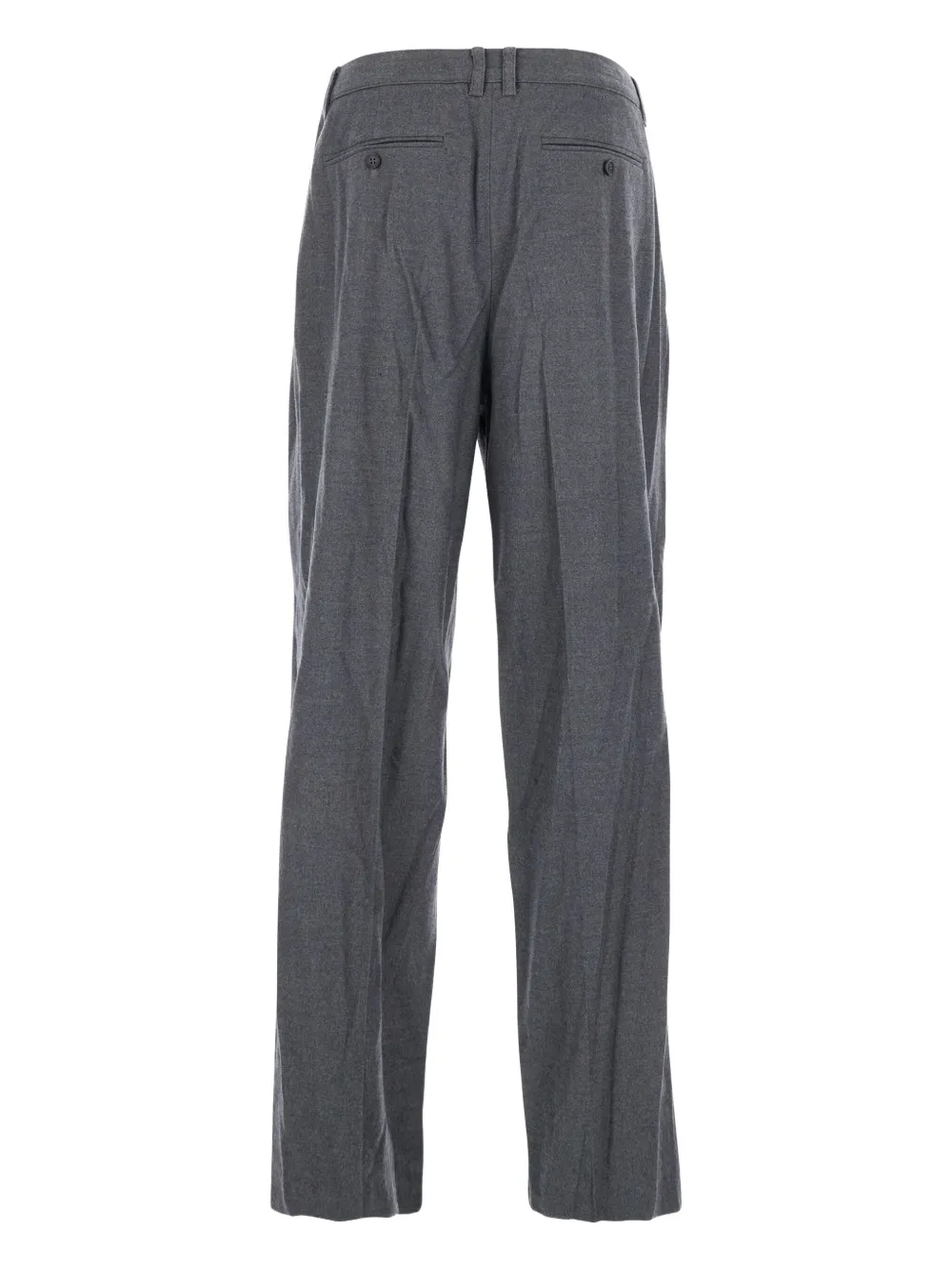 Серые, передние складки, застежка на пуговицы, прорезные карманы, шлевки для ремня