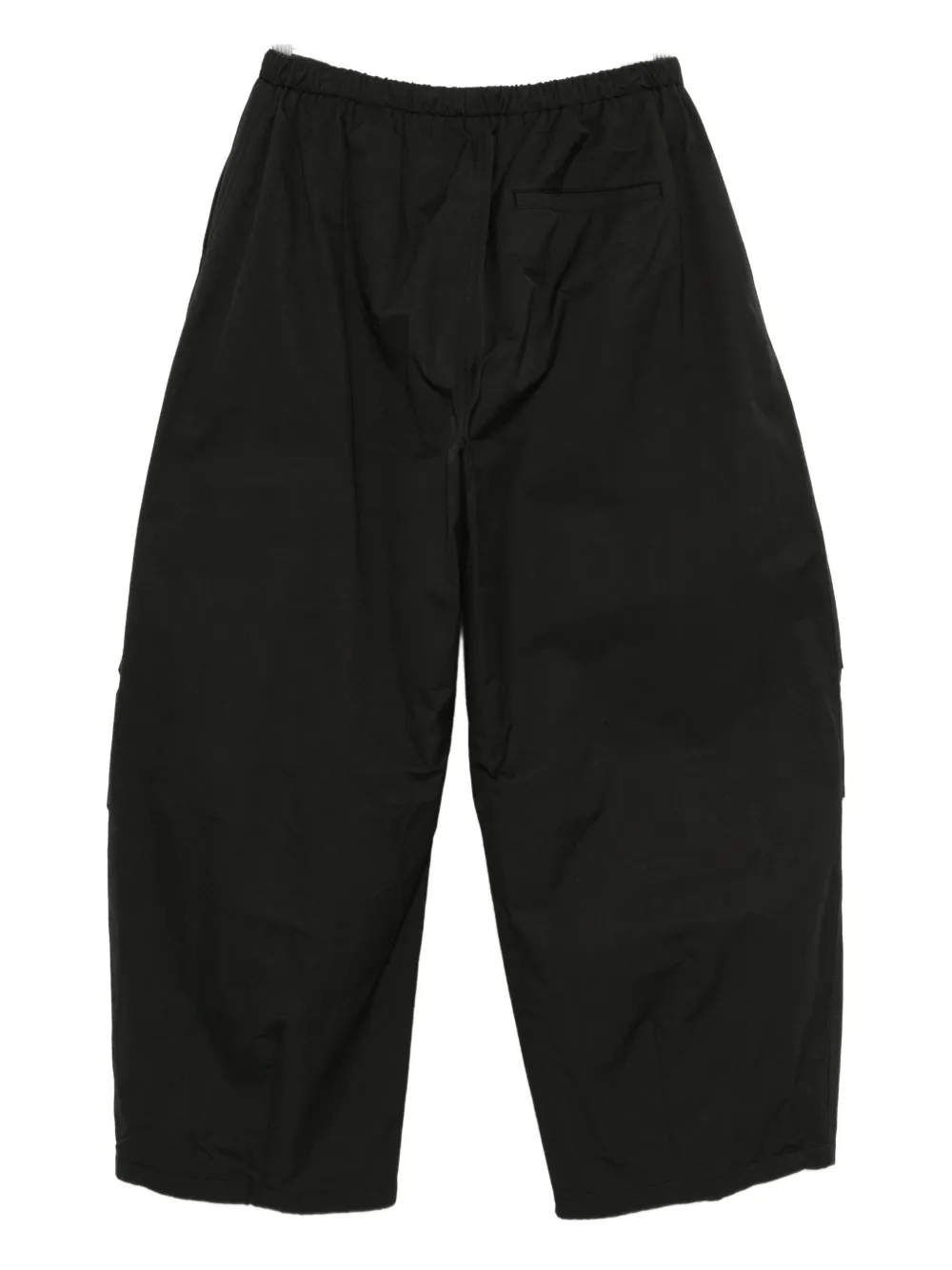 Черный эластичный пояс, боковой накладной карман с клапаном, шнурок, застежка на пуговицу, задний прорезной карман