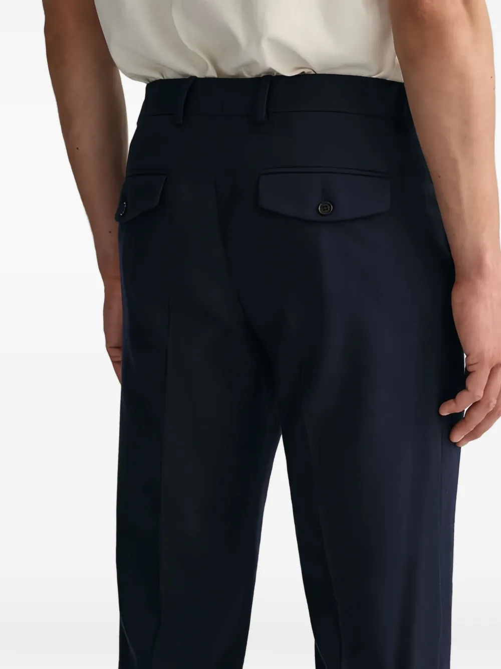 Синие шлевки для ремня, застежка на пуговицу, задние карманы на пуговицах, боковые карманы в швах