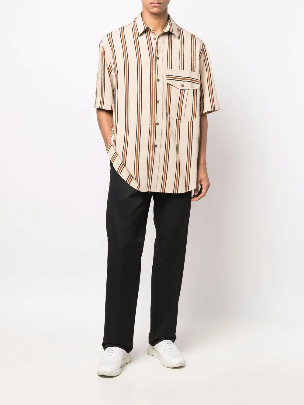 Нашивка с логотипом сзади, петли для ремня, потайная застежка спереди, два вшитых кармана по бокам и два кармана с листочкой сзади.