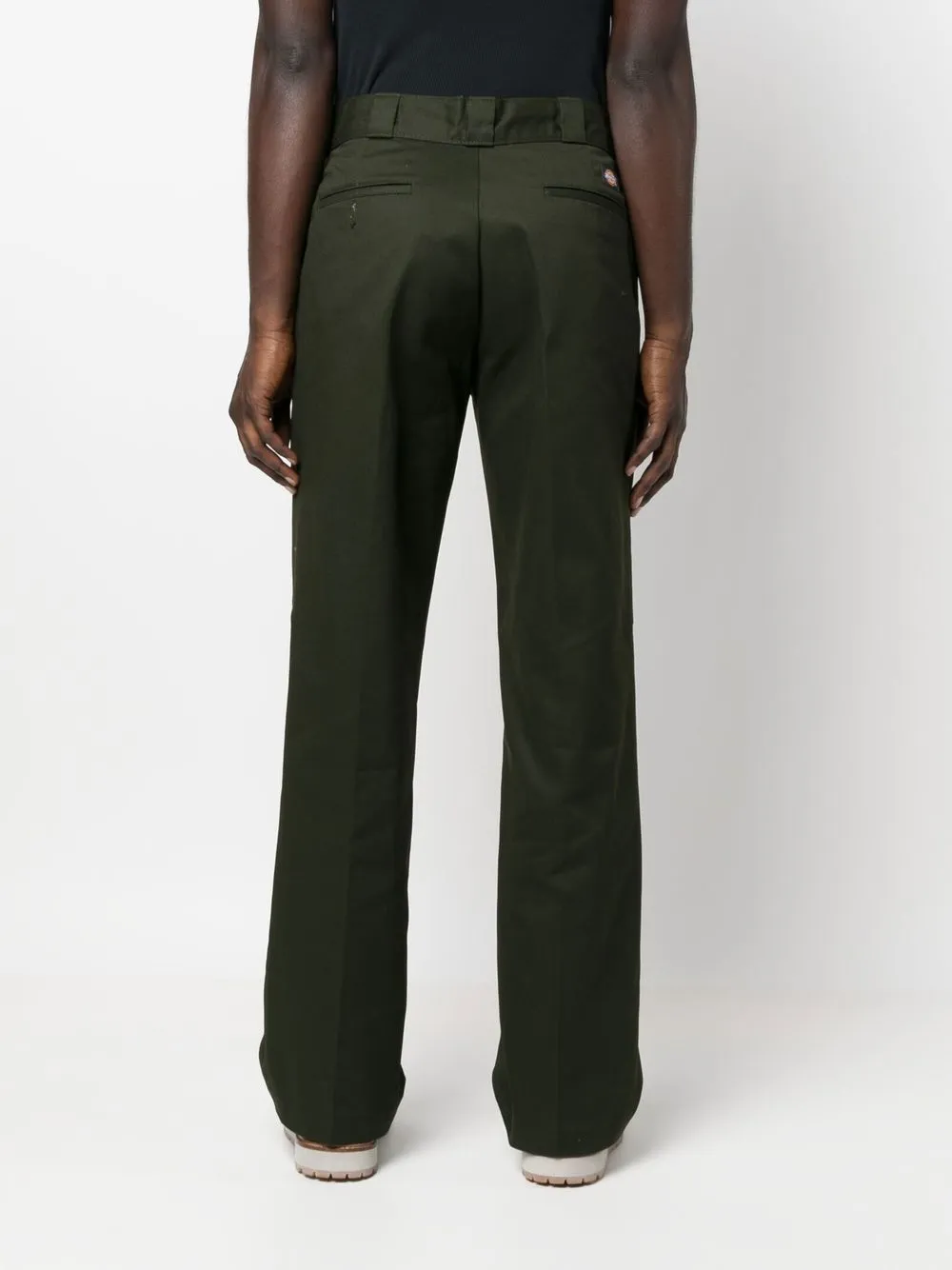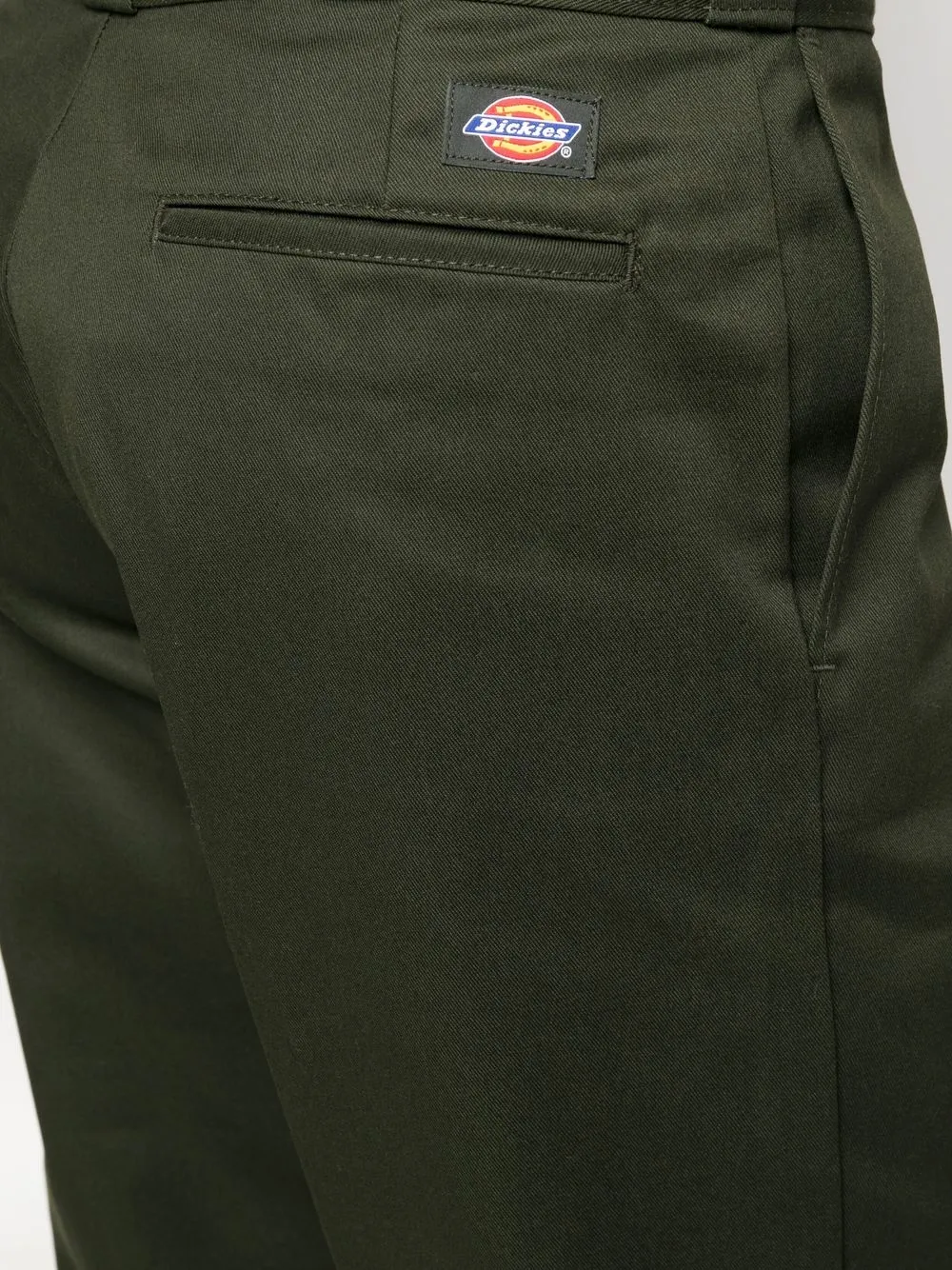 Оливково-зеленый, смесовый хлопок, нашивка с логотипом сзади, потайная застежка спереди, два кармана по бокам, два кармана с листочкой сзади и прямой крой.
