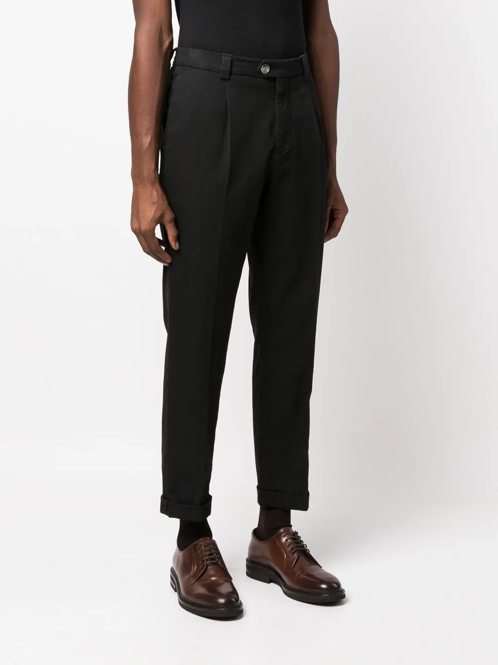 Черный, хлопок, укороченная длина, складки, прямой крой, средняя посадка, петли для ремня, потайная застежка на молнии и пуговицах, два вшитых кармана по бокам, два кармана с листочкой сзади и подвернутые манжеты.
