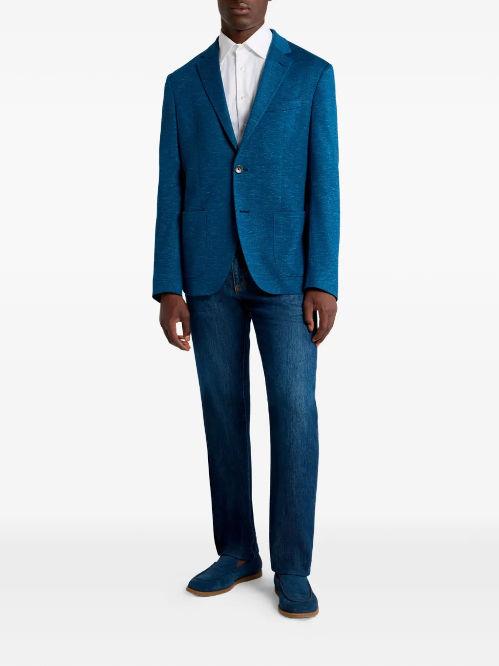 Синий пиджак на двух пуговицах, лацканы с вырезом, накладные карманы