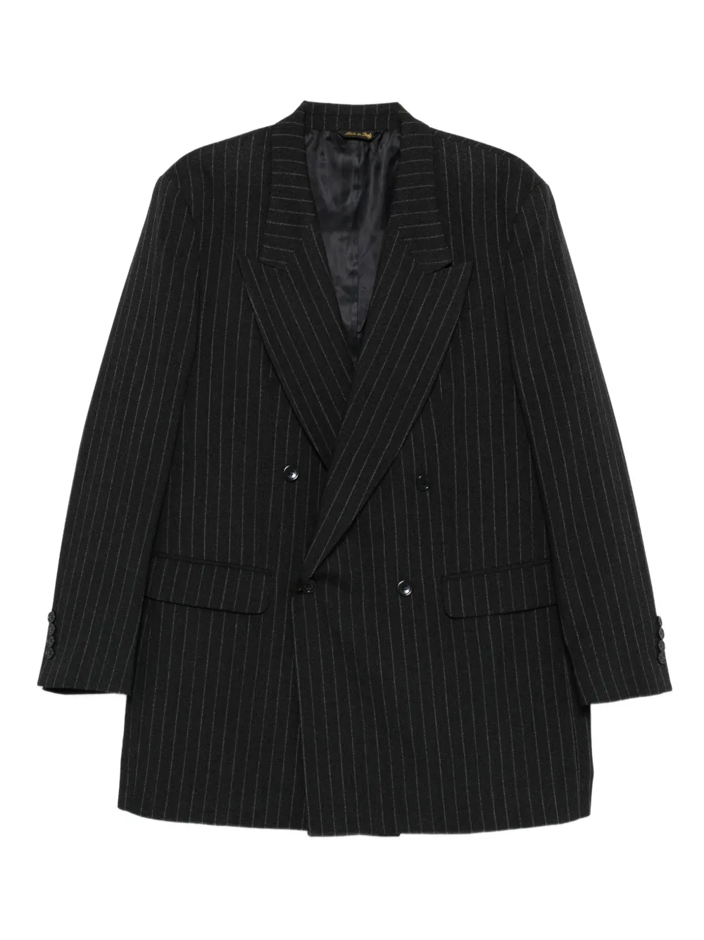 Темно-серый двубортный костюм в тонкую полоску с заостренными лацканами, передними клапанными карманами, застежкой на пуговицы