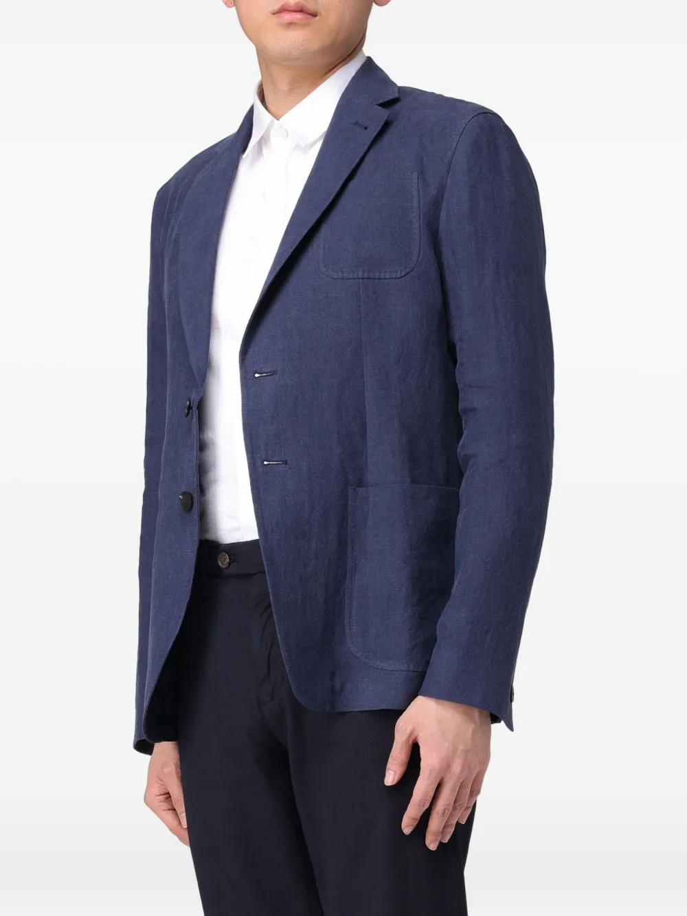Синий однобортный пиджак на пуговицах с накладными карманами, лацканами с вырезом и длинными рукавами