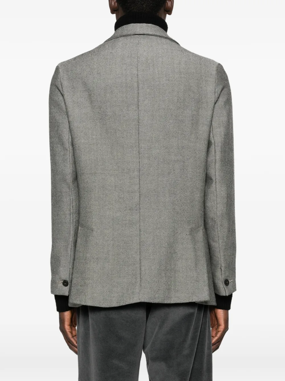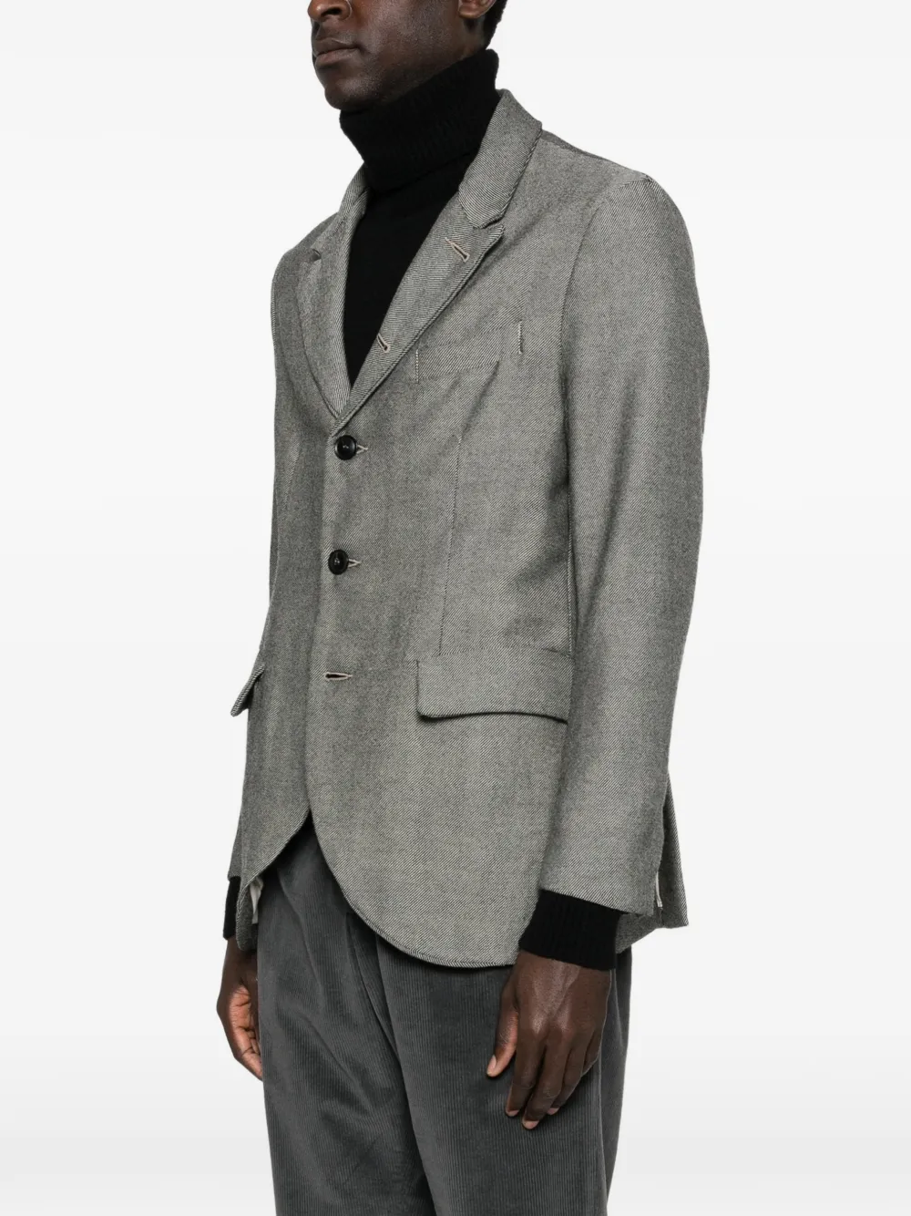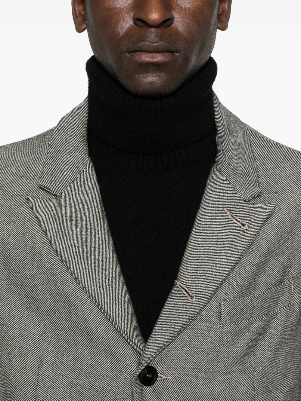 Серый пиджак в полоску, застежка на пуговицы, заостренные лацканы, клапанные карманы, длинные рукава