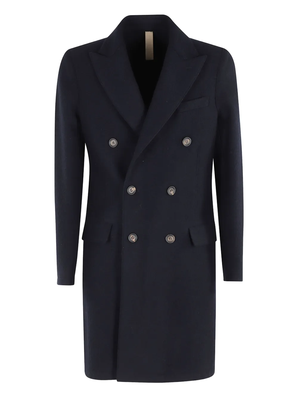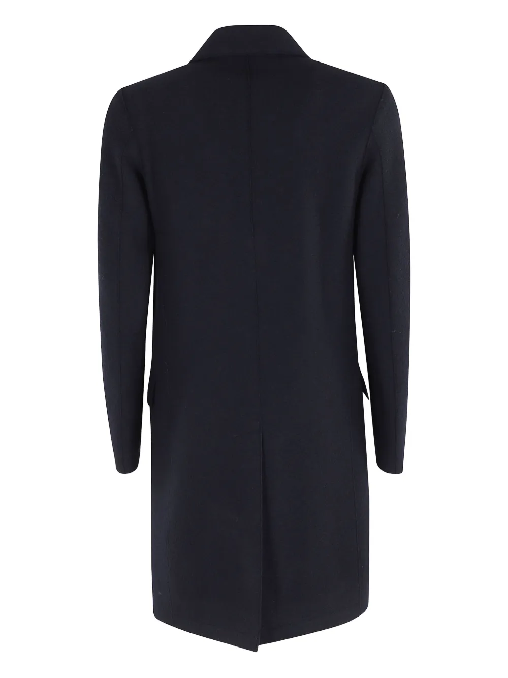 Синий двубортный пиджак с застежкой на пуговицы, лацканами с вырезом и прорезными карманами с клапанами