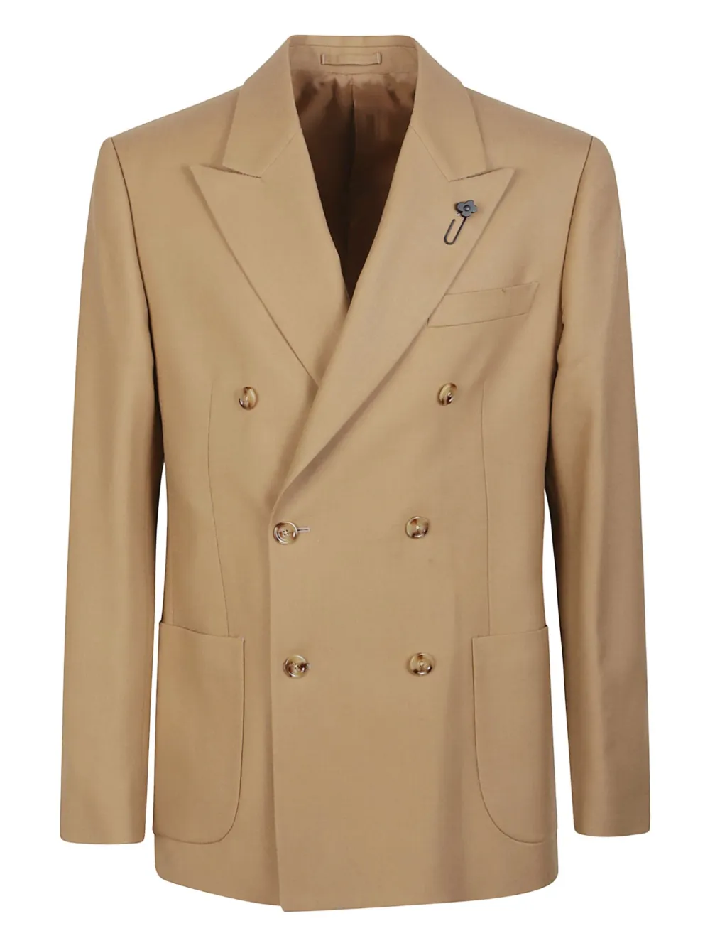 Коричневый двубортный пиджак с накладными карманами, застежкой на пуговицы и лацканами с острыми концами