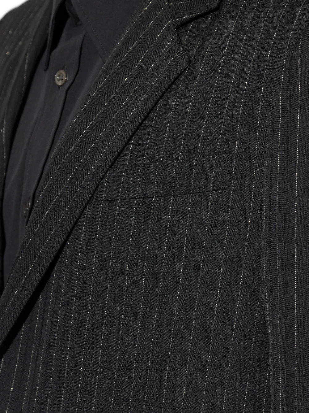 Черный с тонкой полоской, застежка на пуговицы, нагрудный прорезной карман, карманы с клапанами, лацканы с вырезом