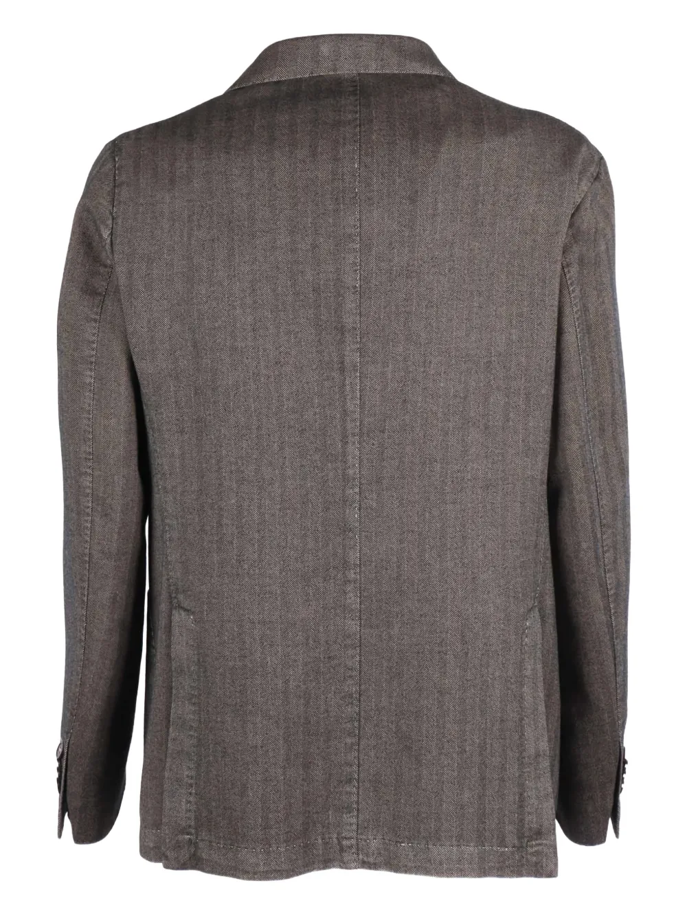 Коричневый узор "елочка", застежка на пуговицы, лацканы с вырезом, прорезные карманы с клапанами, рукава на пуговицах