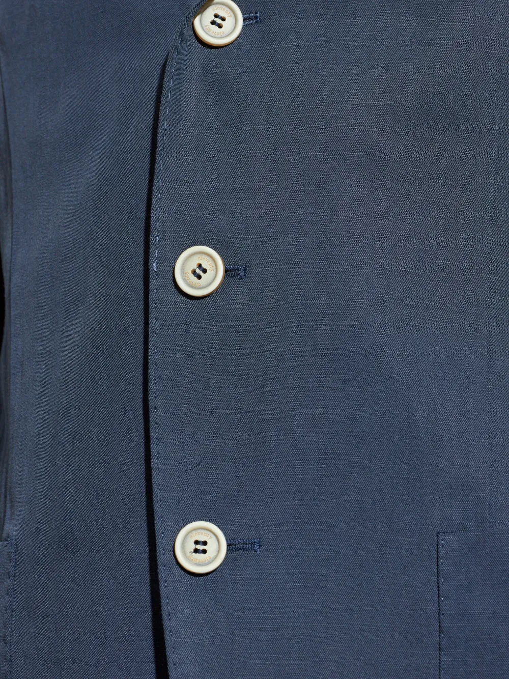 Синий, застегивается на пуговицы спереди, накладные карманы, однобортный, лацканы с вырезом, длинные рукава