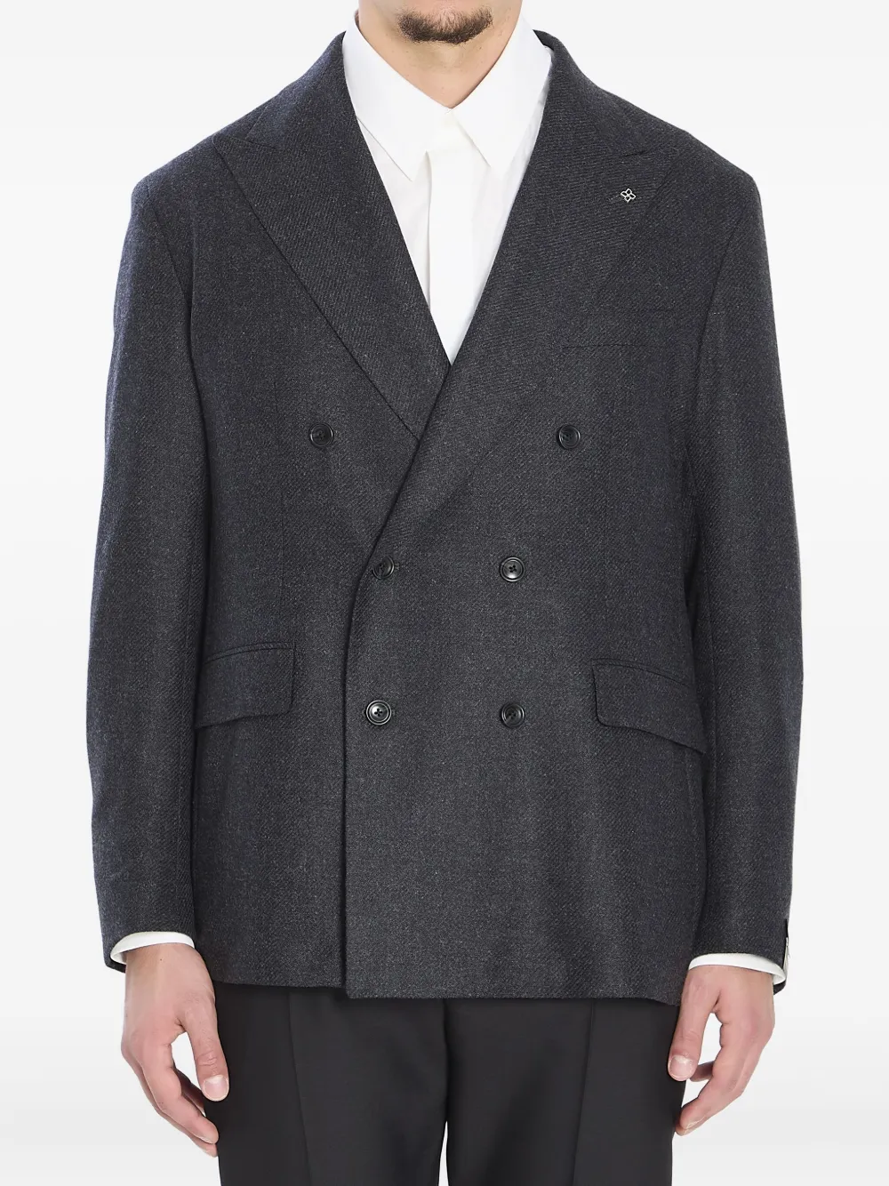 Серые острые лацканы, двубортная застежка на шесть пуговиц, передние карманы с клапанами, манжеты на пуговицах