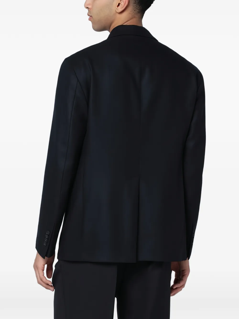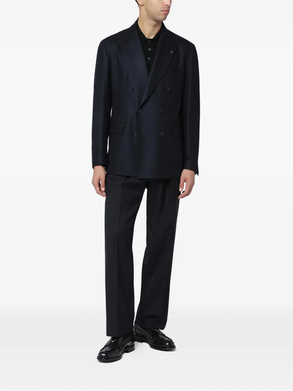 Синий двубортный пиджак, застежка на пуговицы, лацканы с острыми концами, манжеты с четырьмя пуговицами