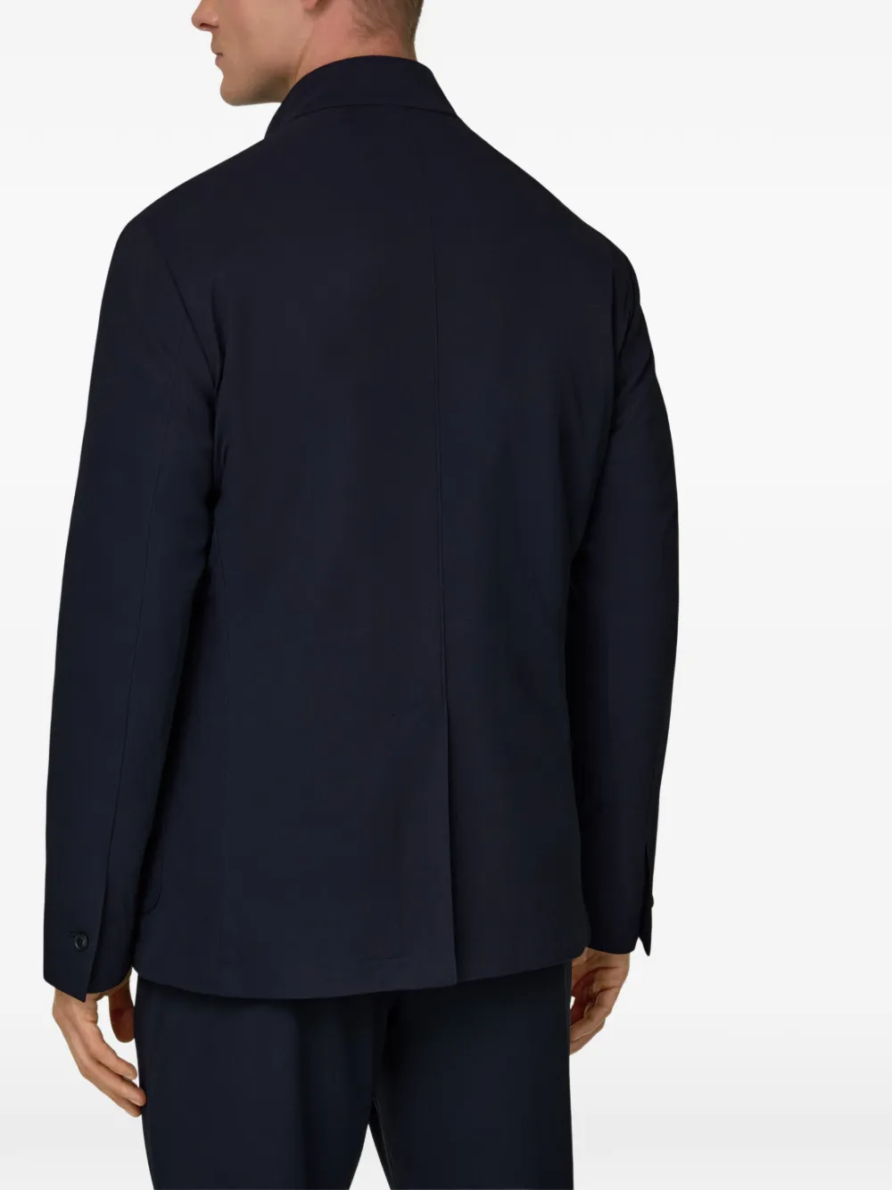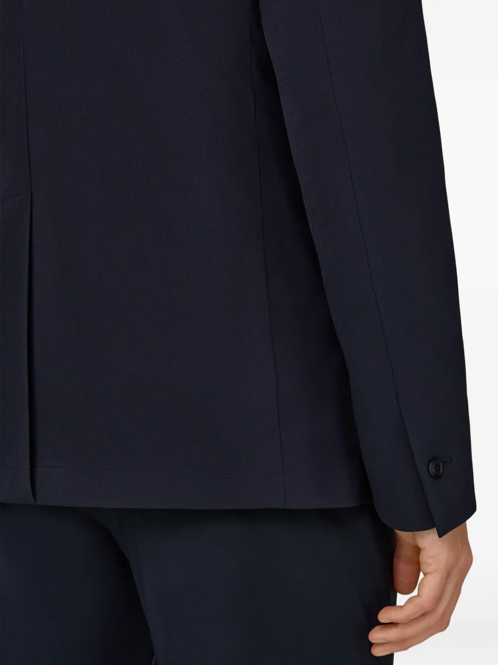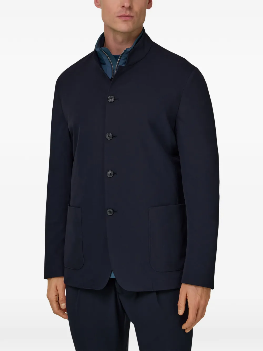 Темно-синий однобортный пиджак прямого кроя с воротником Неру, накладными карманами и застежкой на пуговицы