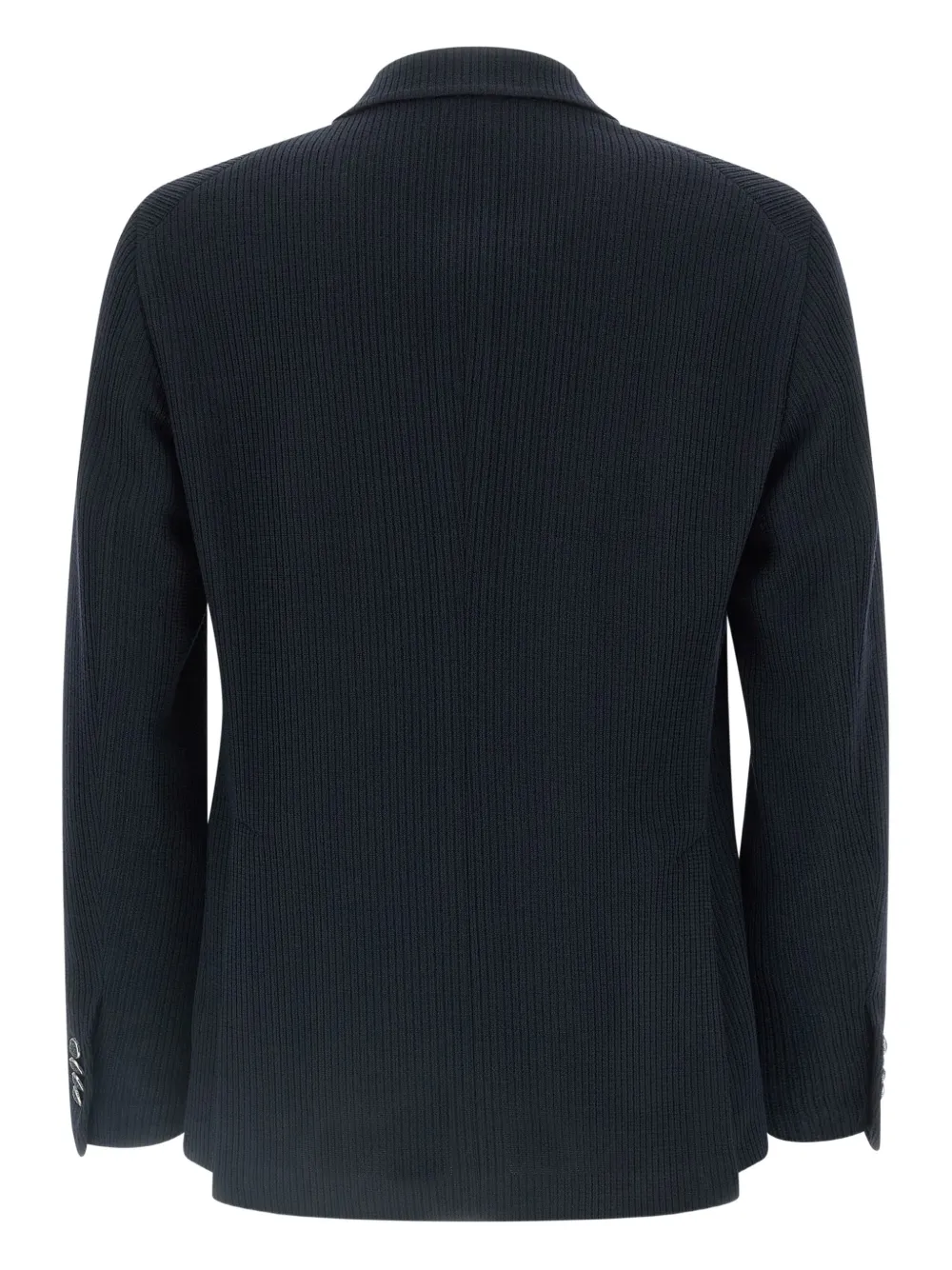 Пиджак-жакет из трикотажного материала в рубчик, двубортный, с заостренным воротником, застежкой на пуговицы, двойной разрез сзади, длинные рукава с пуговицами. 38% полиэстер, 31% шерсть (новозеландская), 31% акрил