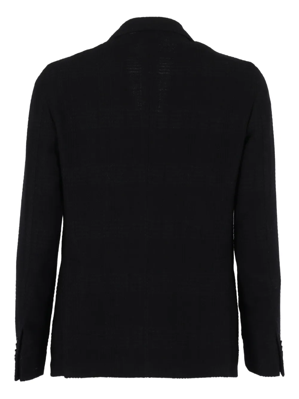 Черный с текстурированной отделкой, двубортный, булавка на лацкане, лацканы с вырезом, застежка на пуговицы